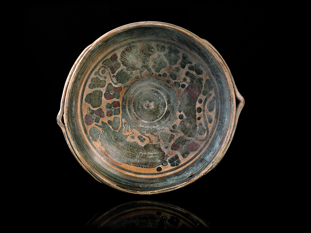 COPPA ETRUSCO CORINZIA DATAZIONE: inizi VI sec. a. C. MATERIA E TECNICA: argilla camoscio, ingubbiatura beige, vernice bruna con ritocchi a vernice paonazza, dettagli resi a graffito, eseguita a tornio veloce. Labbro svasato con orlo arrotondato, vasca troncoconica a profilo rettilineo; anse a bastoncello impostate orizzontalmente sul labbro; piede a disco DECORAZIONE: vasca verniciata all’interno in bruno, sul fondo una sfinge stante a sinistra con le ali raccolte sul dorso e la coda sinuosa, una grande pantera stante a destra con le fauci aperte e la coda allungata sul dorso, un cinghiale gradiente a sinistra, intercalati da grandi rosette a macchia; sul fondo esterno anelli concentrici e gruppi di linguette radiali PRODUZIONE: ceramica etrusca centro meridionale, Ciclo dei Rosoni STATO DI CONSERVAZIONE: integra DIMENSIONI: alt. cm. 6; diam. cm 20 PROVENIENZA: Bertolami Fine Arts, Roma