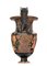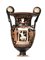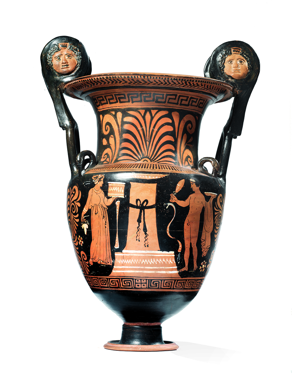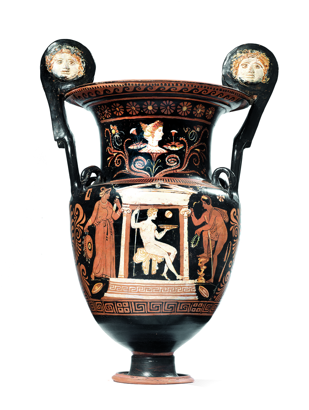 GRANDE CRATERE A VOLUTE APULO A FIGURE ROSSE DATAZIONE: metà IV sec. a. C. MATERIA E TECNICA: argilla figulina camoscio, vernice nera lucente, coloritura arancio, suddipinture in bianco e arancio, modellato a tornio veloce e a stampo Labbro a tesa, con labbro ripiegato e concavo, collo cilindrico a profilo concavo distinto dalla spalla appiattita, grande corpo ovoide, alte anse a volute con margini rilevati impostate su una staffa verticale; lungo la costa verticale dell’ansa, in corrispondenza delle volute, foro circolare sul lato interno; volute racchiudenti due teste di Gorgone suddipinte in bianco, piede campanulato e scanalato al taglio; ai lati delle anse teste di cigno erette col becco appoggiato sulla spalla del vaso. DECORAZIONE ACCESSORIA: interno della bocca verniciato, labbro risparmiato; sotto al labbro fila di puntini; sulla spalla falsa baccellatura, al di sotto delle scene figurate meandro sinistrorso interrotto da motivo a scacchiera; sotto alle anse grande palmetta doppia aperta a ventaglio fra girali e volute; ai lati delle anse teste di cigno in rilievo DECORAZIONE: lato A) sotto il labbro meandro ad onda destrorso, sul collo profilo femminile volto a sinistra con kekryphalos, stephane di perle, orecchini e collana che sorge da un fiore ed è circondato da grandi volute e infiorescenze; sul ventre naiskos in bianco con colonne ioniche sotto al quale si trova la figura del defunto, in nudità eroica, seduto a sinistra sul suo mantello, le gambe incrociate, in atto di appoggiarsi alla lancia e sostenere una phiale; alla sua sinistra una giovane donna riccamente abbigliata in atto di offrirgli un unguento contenuto nell’alabastron che sorregge nella mano sinistra mentre nella destra tiene un cembalo; dall’altro lato un giovane nudo volto verso il defunto col mantello drappeggiato sulla spalla e sul torace con strigile nella mano destra e corona nella sinistra; ai lati del podio due grandi patere; lato B) sotto al labbro motivo a chevron, sul collo meandro continuo destrorso e grande palmetta aperta a ventaglio fra volute; sul ventre stele funeraria su podio a cui è legata una tenia nera sormontata da un grande bacile; a sinistra giovane donna riccamente abbigliata con un grappolo d’uva nella mano destra ed un cista e una tenia nella sinistra; dall’altro lato un giovane nudo con mantello drappeggiato sul braccio sinistro che sorregge una phiale mentre nella destra tiene uno specchio e una tenia PRODUZIONE: ceramica apula a figure rosse, Gruppo di Copenhagen, Pittore di Copenhagen 4223 STATO DI CONSERVAZIONE: integralmente ricomposto da frammenti con alcuni restauri alla pittura DIMENSIONI: alt. cm 52, diam. bocca cm 18 PROVENIENZA: CS1Firenze CFR.: A.D. Trendall,The Red-figured Vases of South Italy and Sicily, Oxford 1978-1982, pp. 456, 462-3