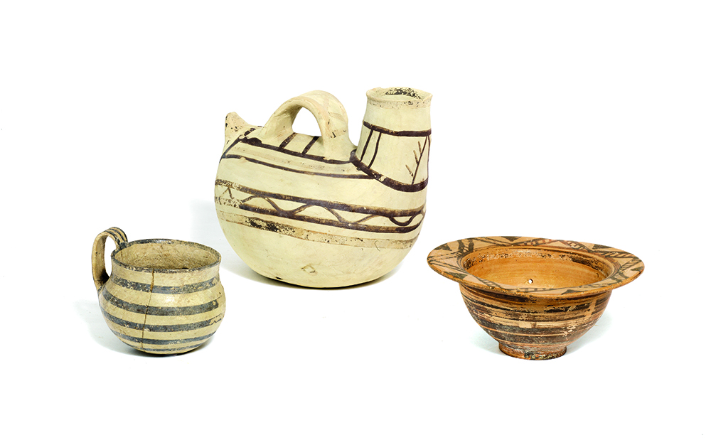 ASKOS, ATTINGITOIO E COPPA DAUNIE Forma V, tipo 19, De Juliis 1977 DATAZIONE: Subgeometrico Daunio III, metà IV sec. a. C. MATERIA E TECNICA: argilla giallina; vernice bruna; modellati a mano e a tornio lento Askos con orlo lievemente svasato indistinto dal collo cilindrico, corpo globoso allungato, con estremità posteriore appuntita, fondo piatto; ansa a nastro impostata longitudinalmente sul dorso, decorato a fasce orizzontali e motivi a zig-zag; attingitoio con orlo svasato, corpo globulare, fondo piatto, ansa a nastro impostata dall’orlo alla spalla, decorato a fasce orizzontali; coppa con labbro svasato e appiattito e vasca troncoconica profonda, piede ad anello, decorata sul labbro con triangoli fasce campite da trattini, sulla vasca con fasce parallele (3) PRODUZIONE: ceramica daunia STATO DI CONSERVAZIONE: integri askos e coppa, ricomposto l’attingitoio DIMENSIONI: alt. da cm. 18 a cm 7,5 CFR.: E. M. De Juliis La ceramica geometrica della Daunia Firenze 1977 PROVENIENZA: Bertolami Fine Arts, Roma