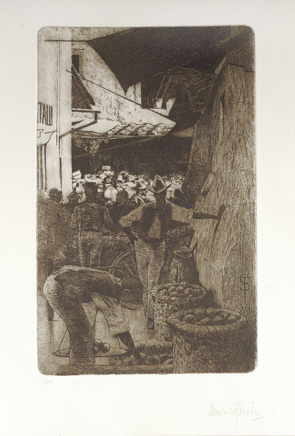 Telemaco Signorini (Firenze, 1836 - 1901) Il mercato Vecchio Acquaforte, mm. 475x330 (foglio); mm. 372x235 (lastra); es. 46/100 Firma in lastra in basso a destra. Firma Enrico Signorini in basso a destra. Foglio proveniente da: Telemaco Signorini, Il Mercato Vecchio di Firenze ed altre composizioni, presentazione di Piero Bargellini, Gonnelli editore, Firenze, 1967 € 300/400