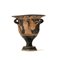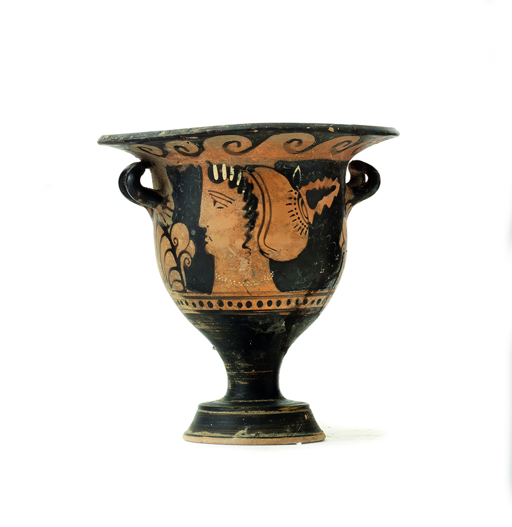 CRATERE A CAMPANA APULO DATAZIONE: metà IV sec. a. C. MATERIA E TECNICA: argilla figulina camoscio, vernice nera lucente, suddipinture in bianco e giallo, coloritura arancio; modellato a tornio veloce Labbro estroflesso distinto, con orlo arrotondato, corpo campaniforme, anse a bastoncello, impostate orizzontalmente e ritorte verso l’alto; piede a echino modanato DECORAZIONE ACCESSORIA: sotto il labbro meandro ad onda; sotto le anse palmetta aperta a ventaglio fra girali e volute, spazio fra le anse risparmiato, falsa baccellatura all’attacco delle anse; sotto le due scene figurate motivo puntiforme DECORAZIONE: su entrambi i lati profilo femminile volto a destra; con kekryphalos ricamato, stephane radiata, orecchini e collana di perle a doppio filo STATO DI CONSERVAZIONE: integralmente ricomposto da frammenti PRODUZIONE: ceramica apula a figure rosse DIMENSIONI: alt. cm 21,6, diam. bocca cm 19 CFR.: A. D.Trendall, A. Cambitoglou, The Red-figured Vases of Apulia I, Oxford 1982, pl. 123