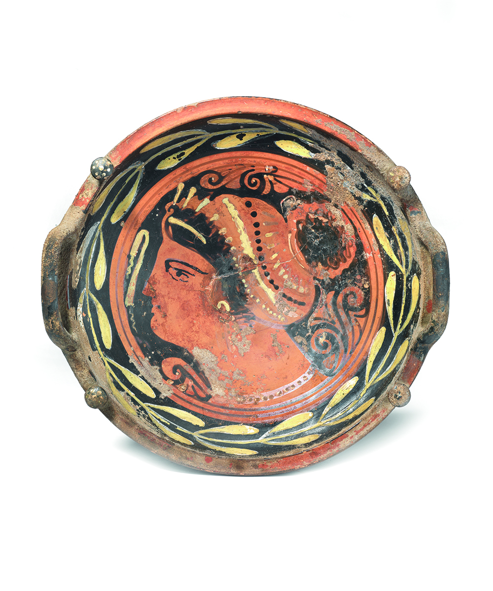PHIALE APULA A FIGURE ROSSE DATAZIONE: fine del IV sec. a. C. MATERIA E TECNICA: argilla figulina camoscio, vernice nera, suddipinture in bianco e giallo, coloritura arancio; modellata a tornio veloce Labbro orizzontale con orlo rilevato, vasca troncoconica, piede ad echino modanato, anse a nastro impostate orizzontalmente sul labbro fra due protomi a bottone. DECORAZIONE: al centro medaglione delimitato da un grande ramo di olivo in bianco, campito da un grande profilo. femminile volto a destra con kekryphalos da cui fuori esce un vaporoso ciuffo di capelli, la donna porta una sthepane radiata, orecchini e filo di perle; nel campo volute vegetali PRODUZIONE: ceramica apula a figure rosse STATO DI CONSERVAZIONE: integra con incrostazioni e filatura da cottura DIMENSIONI: alt. cm 9; diam. cm 34 CFR: A. D.Trendall, A. Cambitoglou, The Red-figured Vases of Apulia II, Oxford 1982 PROVENIENZA: Minerva Auctions, Roma