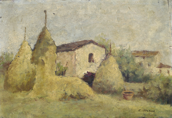 Elena Soldani Casolare e pagliai Olio su compensato, cm. 23x33 Firmato in basso a destra: "E. Soldani". Sul verso: etichetta XIII Mostra Interprovinciale/ Sindacato Interprovinciale Fascista/Belle Arti di Firenze. € 200/300