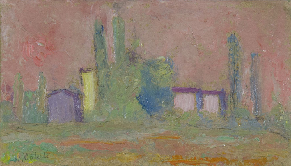 Nando Coletti 1907-1979 "Paesaggio rosa" cm. 9x16 - olio su cartone Firmato b. a s.