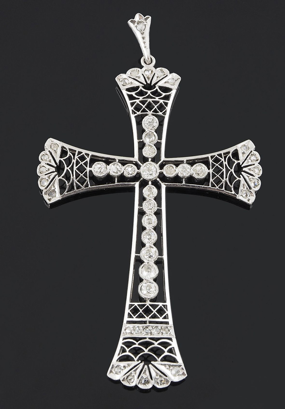 Ciondolo a forma di croce in oro bianco , lavorazione a traforo con diamanti taglio brillante