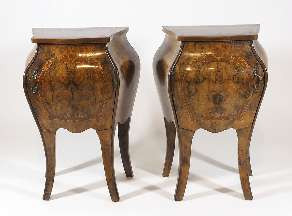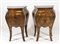 Coppia di comodini fortemente bombati con anta, intarsi in legni vari.