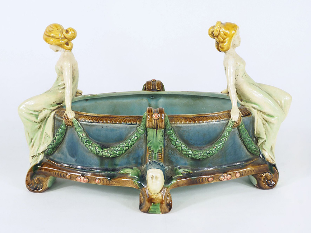 Centrotavola di forma ovale in ceramica policroma con manici a forma di figure femminili. Firmata sotto la base G. Martineak. Lung. cm. 33.