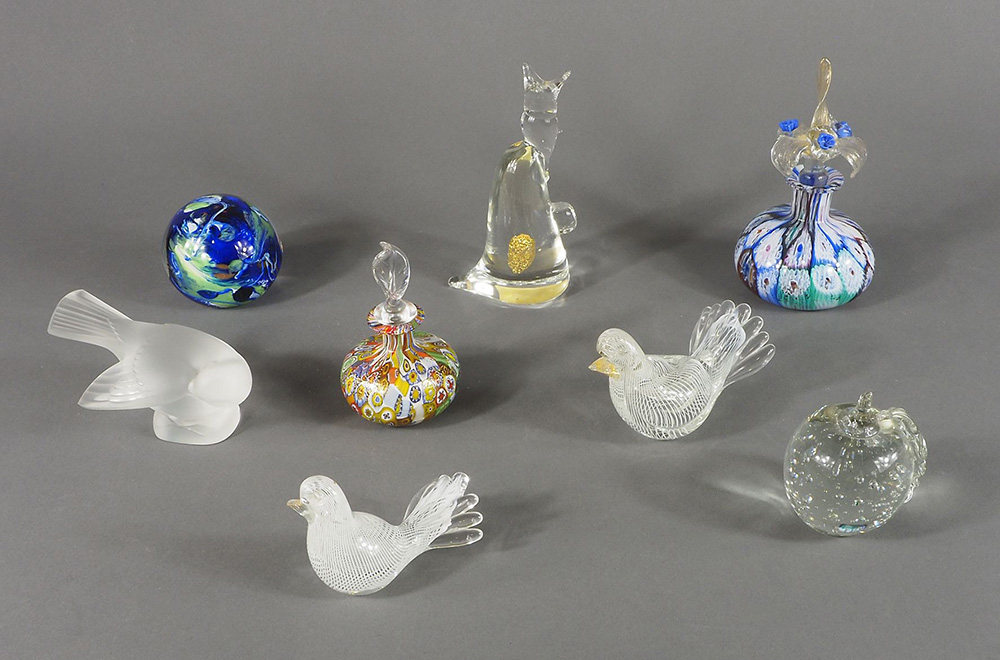 Lotto di vari oggettini in vetro tra cui animaletti e presspapier. (restauro).