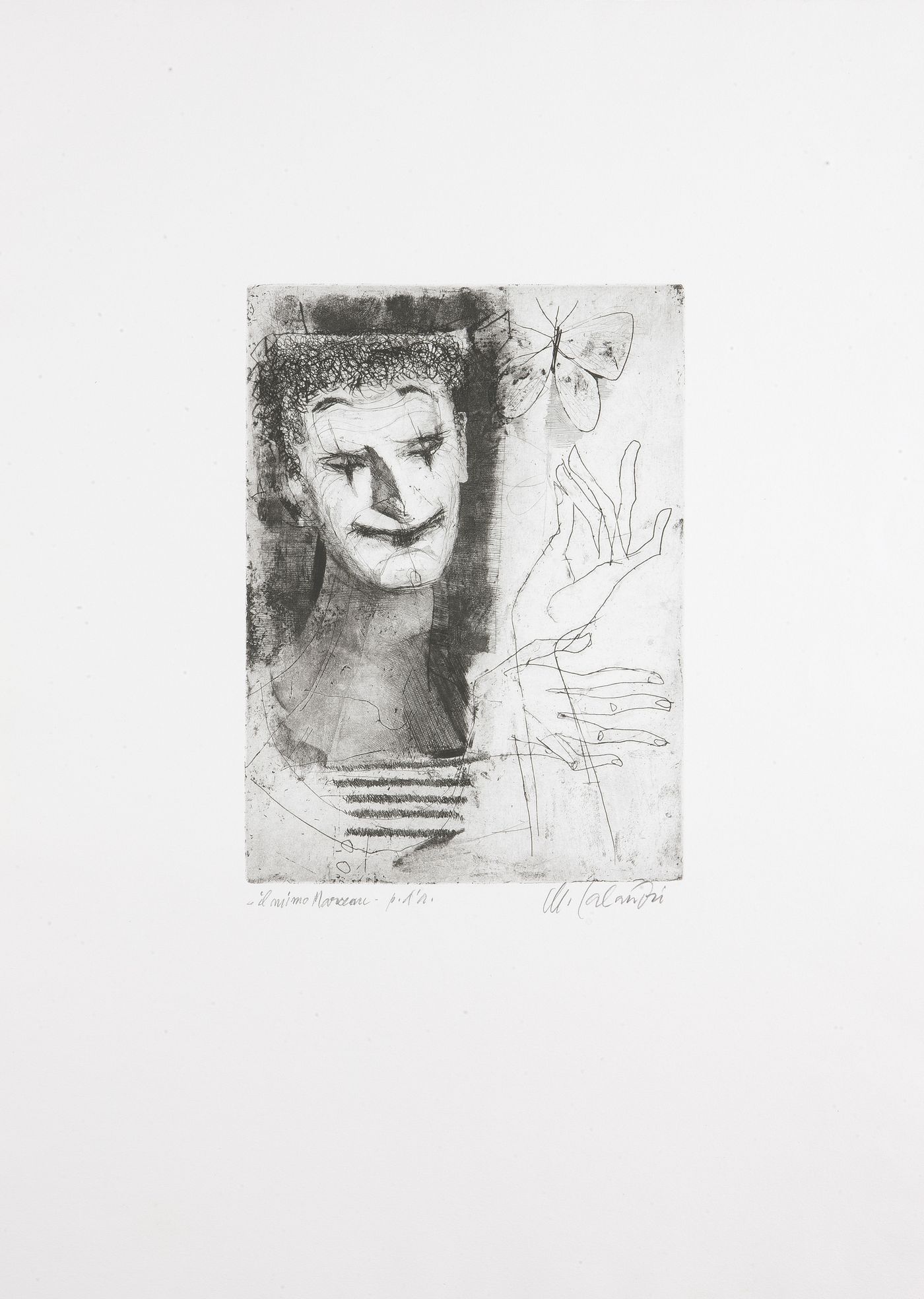 CALANDRI MARIO Torino 1914 - 1993 "Il mimo Marceau" 1957 70x50 (foglio), 23,7x32,4 acquaforte p.a. Opera firmata in basso a destra, intitolata in basso a sinistra