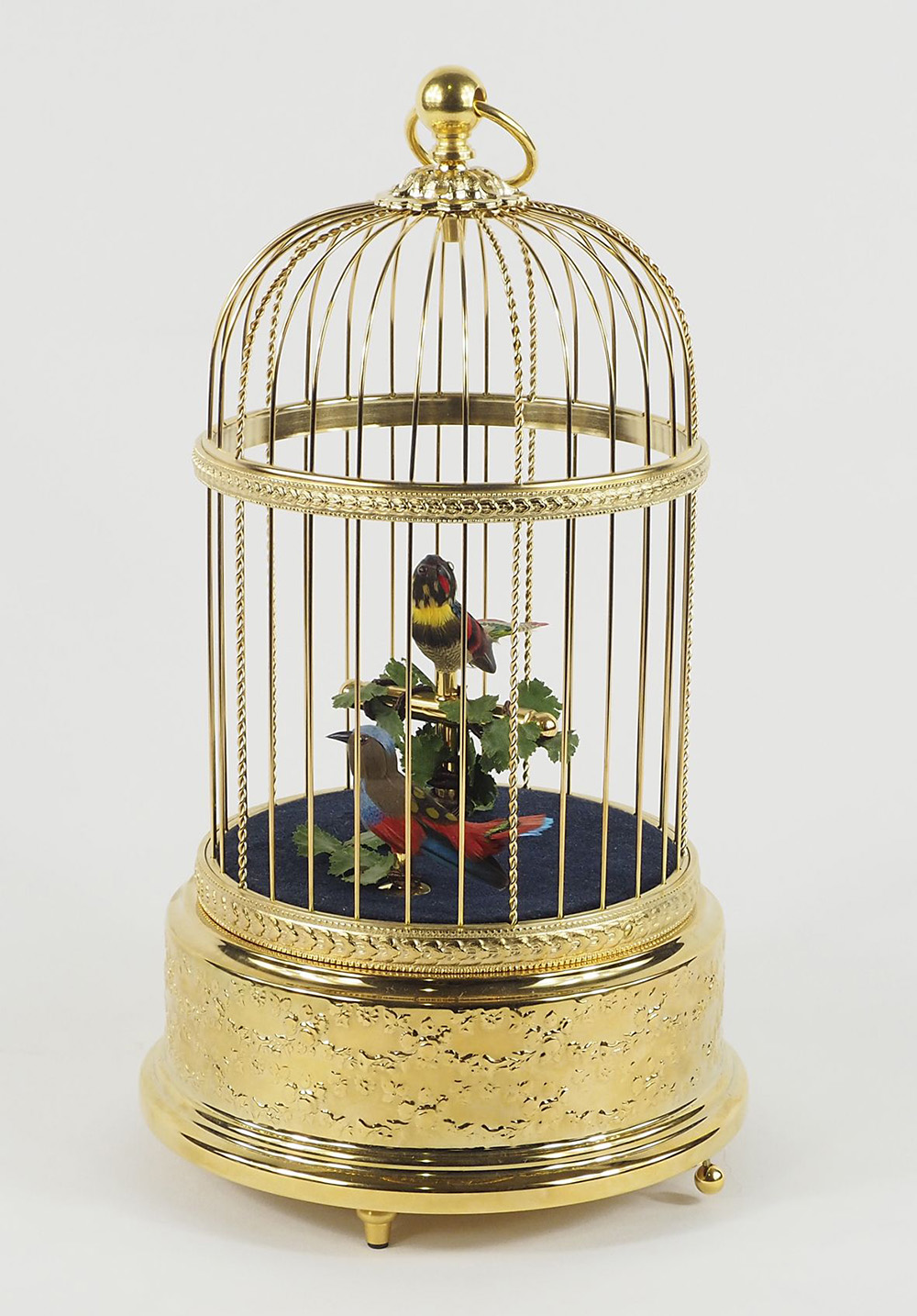 Reuge a Sainte Croix: carillon raffigurante uccelli canterini entro gabbia dorata. H. cm. 29.