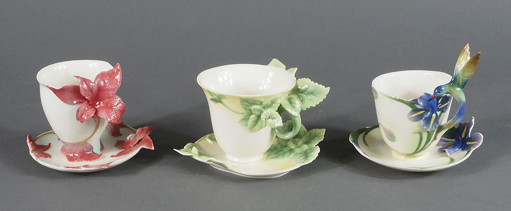 Lotto di 3 tazzine in porcellana policroma "Franz" con piattini, decorate con figura di uccello e motivi floreali.