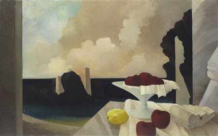 Tommaso Tommasi (Arbus, 1955) Natura morta con mele, limone, vaso e mare, 1994/1995 Olio su tela, cm. 50x80 Firma e data in basso a destra Sul verso:firma, data e titolo. € 150/250