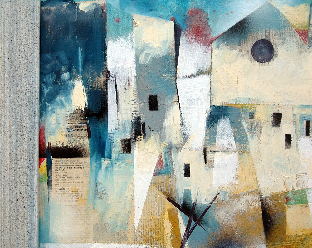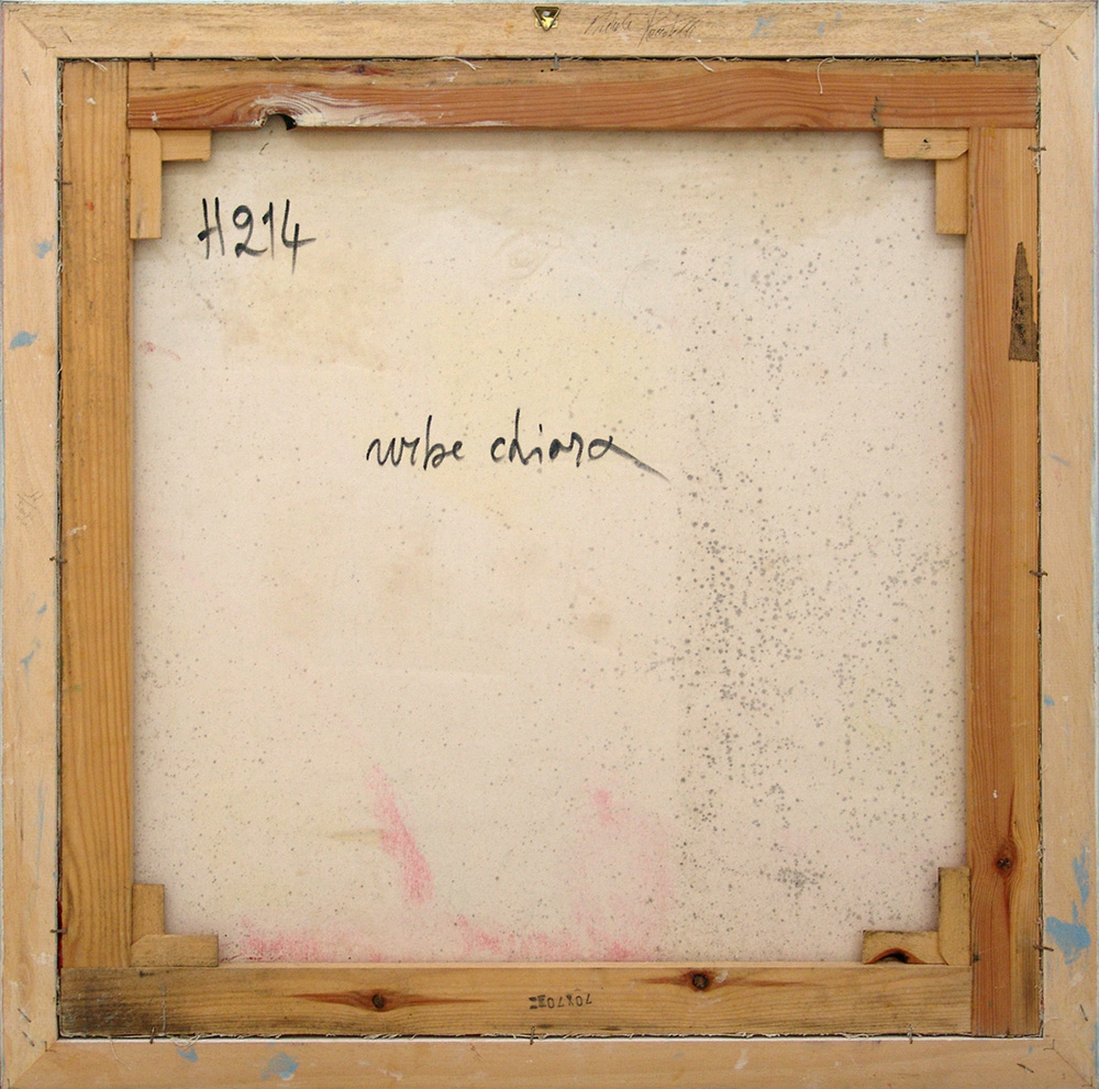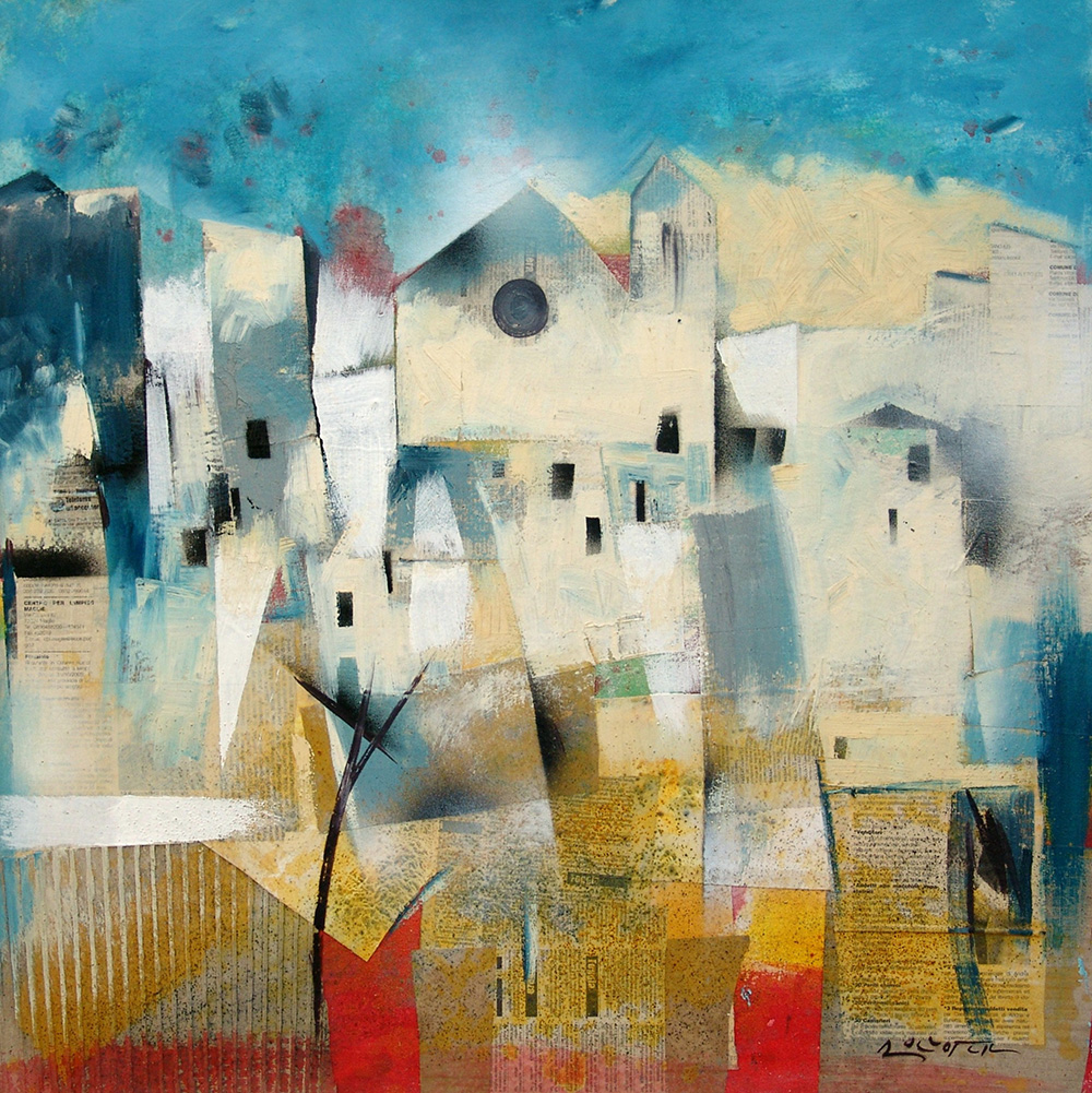 Michele Roccotelli 1946, Minervino Murge (Bt) - [Italia] Urbe chiara olio e collage su tela 70x70 cm firma dell’artista in basso a destra e sul retro; opera con cornice certificato di autenticità firmato dall'artista
