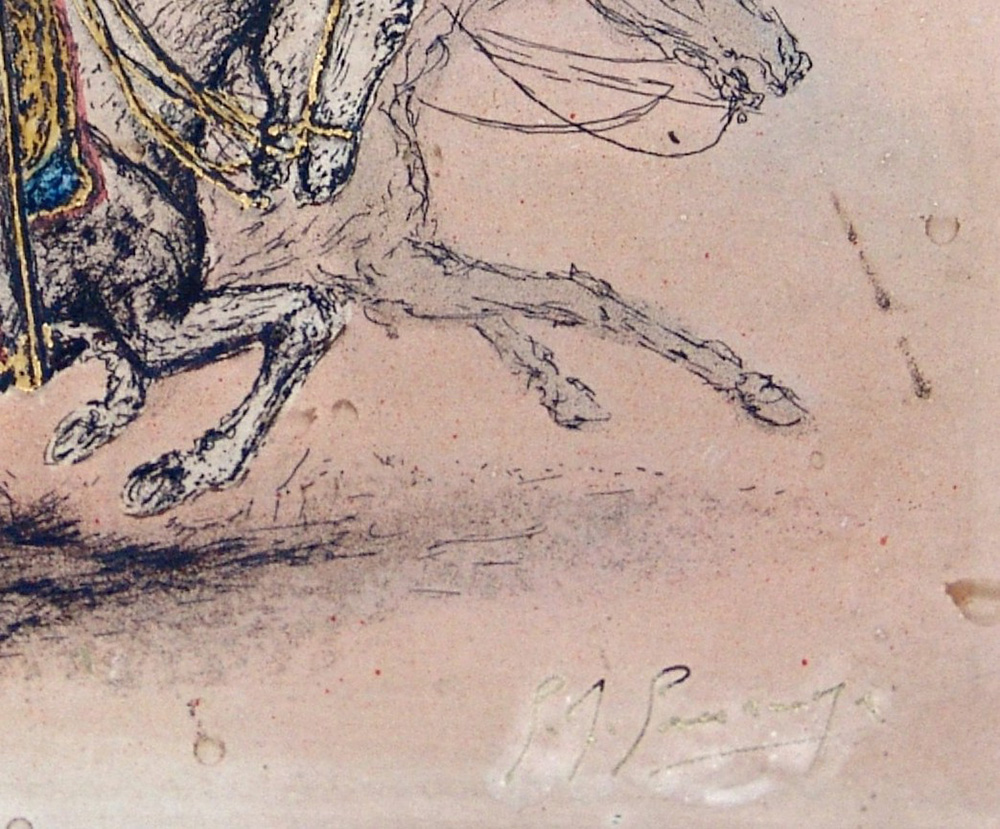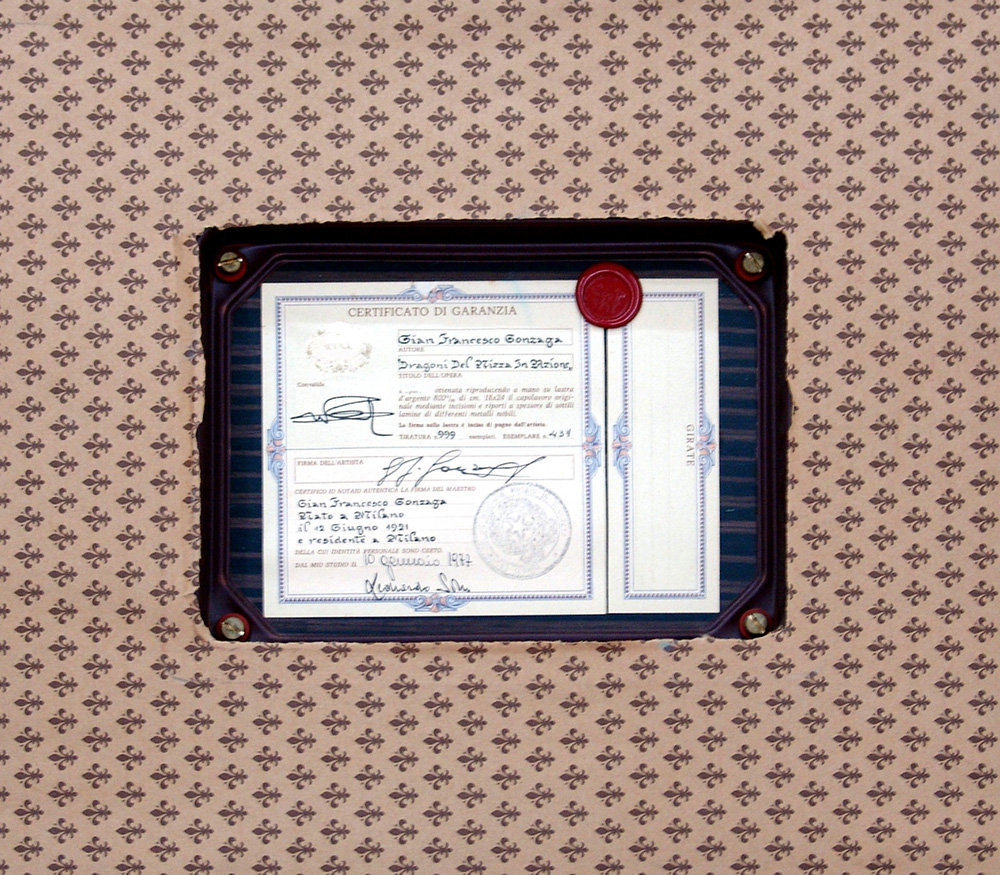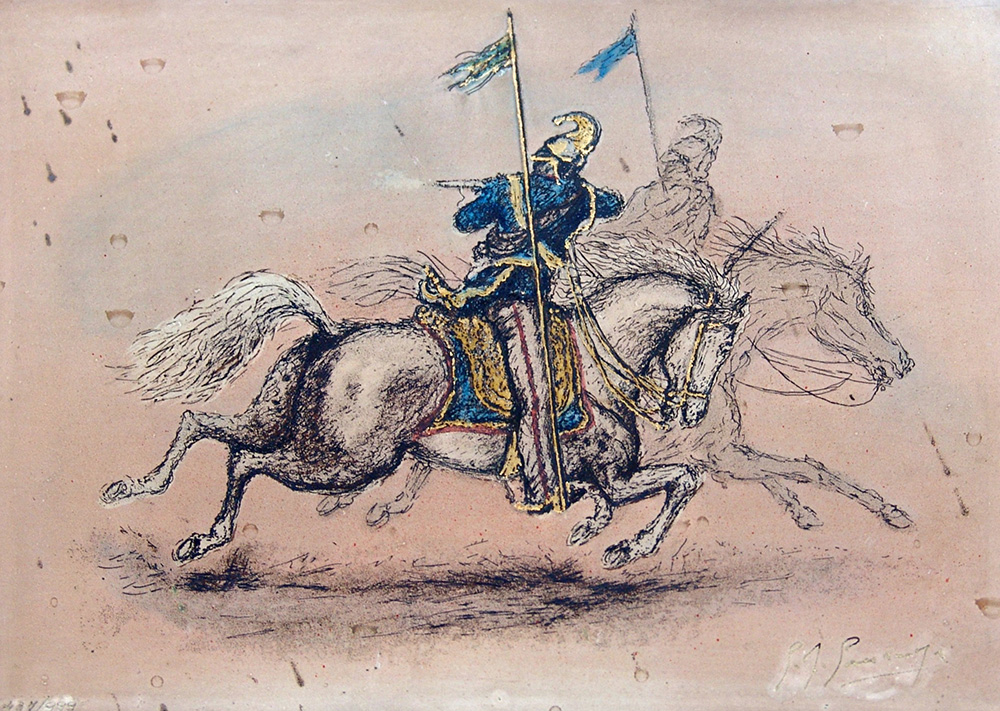 Giovan Francesco Gonzaga 1921, Milano (Mi) - 2007, Milano (Mi) - [Italia] Dragoni del Nizza in azione incisione 17,5x23,5 cm 1977 es. 437/999; firma dell'artista in basso a destra; opera con cornice certificato di autenticità firmato dall'artista