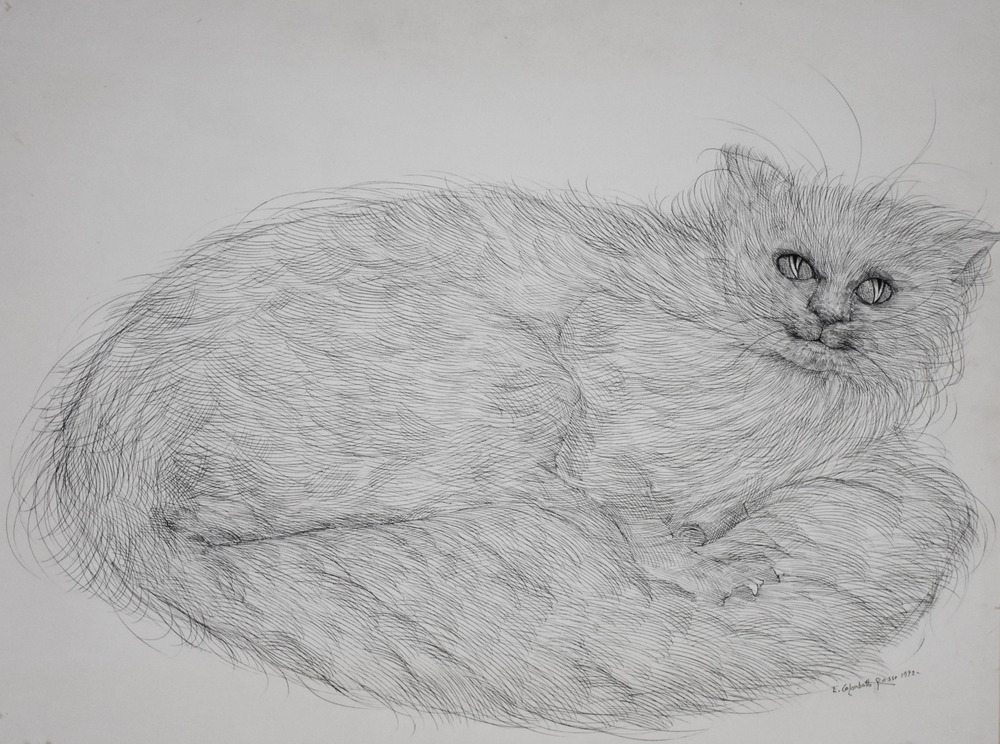 Colombotto Rosso Enrico GATTO disegno su carta intelata a pennino china, cm 55x76 sul fronte: firma e data eseguito nel 1972 L'opera è accompagnata da autentica dell'artista su fotografia