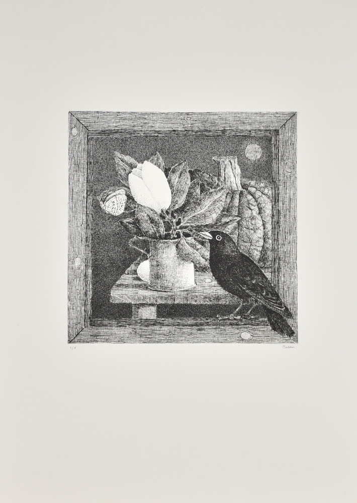Bellini Enzo Merlo e Magnolia acquaforte su carta, cm 70x50 (lastra cm 31x31) esemplare II su X sul fronte: firma