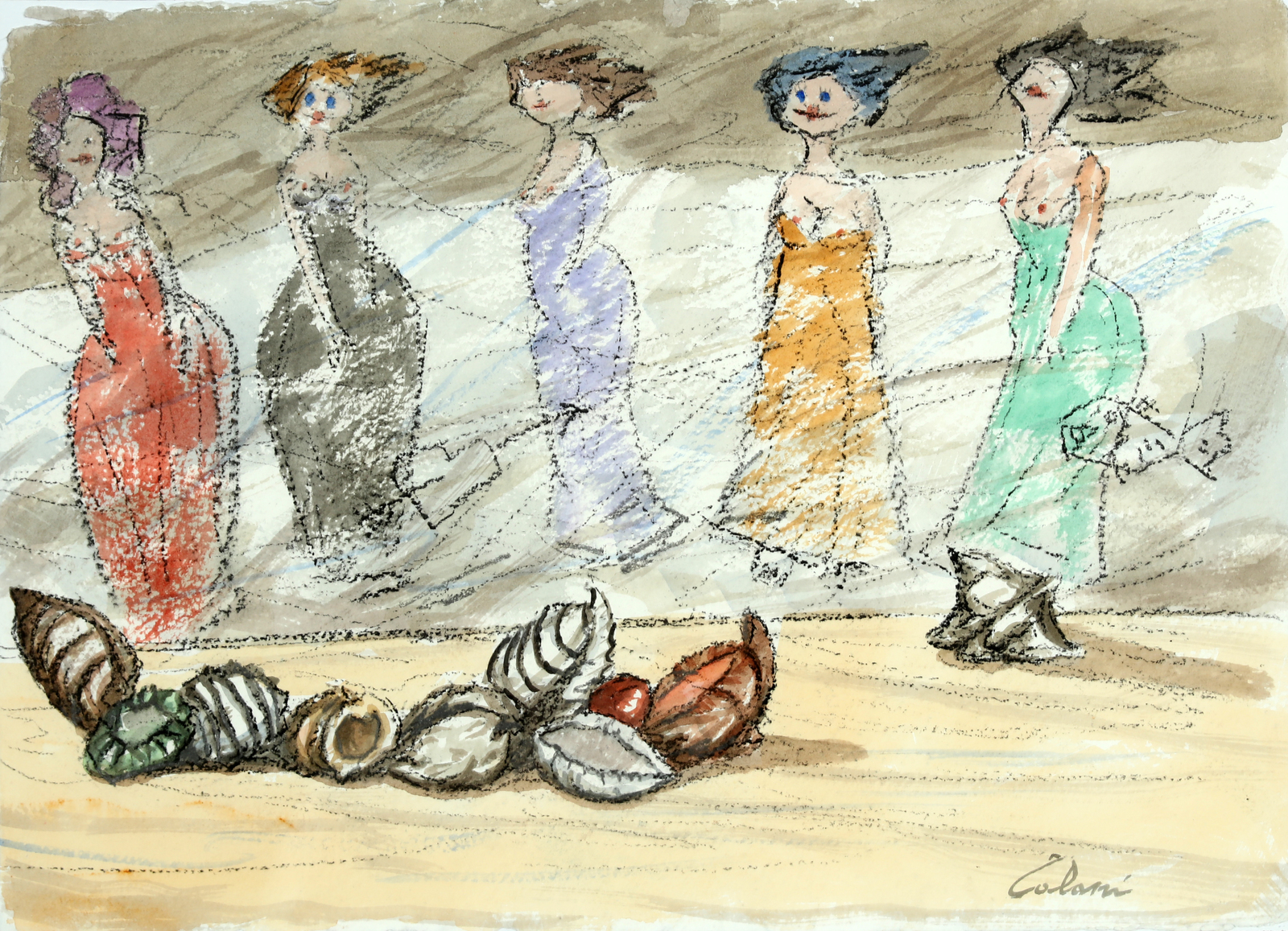 TALANI GIAMPAOLO (n. 1955) Donne sul muro. Tecnica mista su carta. Cm 50,00 x 35,00. Firma in basso a destra. Al retro titolo e timbro oltremare Arte. Cornice presente