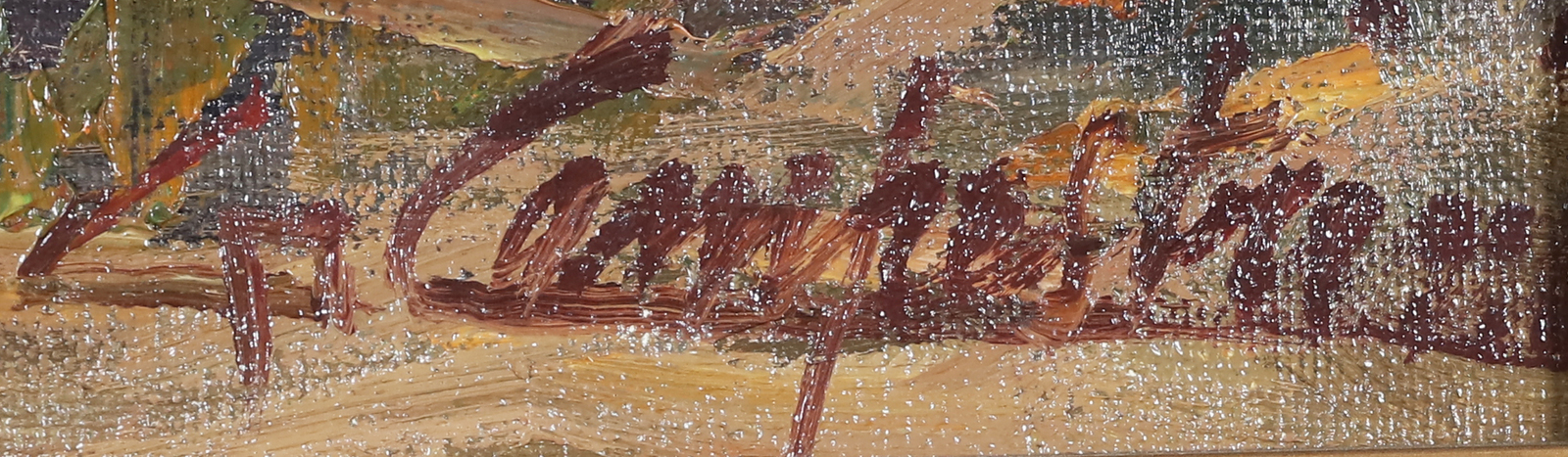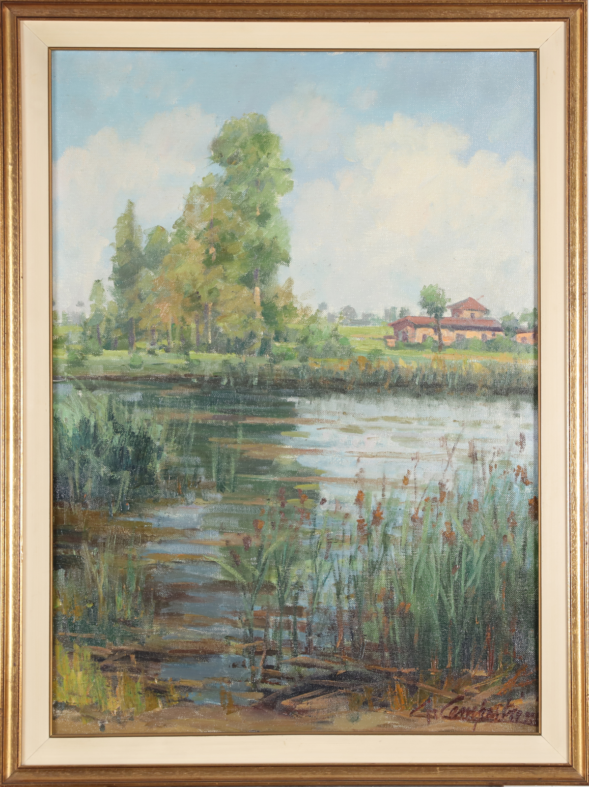 CAMPESTRINI GIANFRANCO (1901 - 1979) On the river. Oil on canvas . Cm 50,00 x 70,00. Signature lower right. Signature and title at the back. Cornice presente