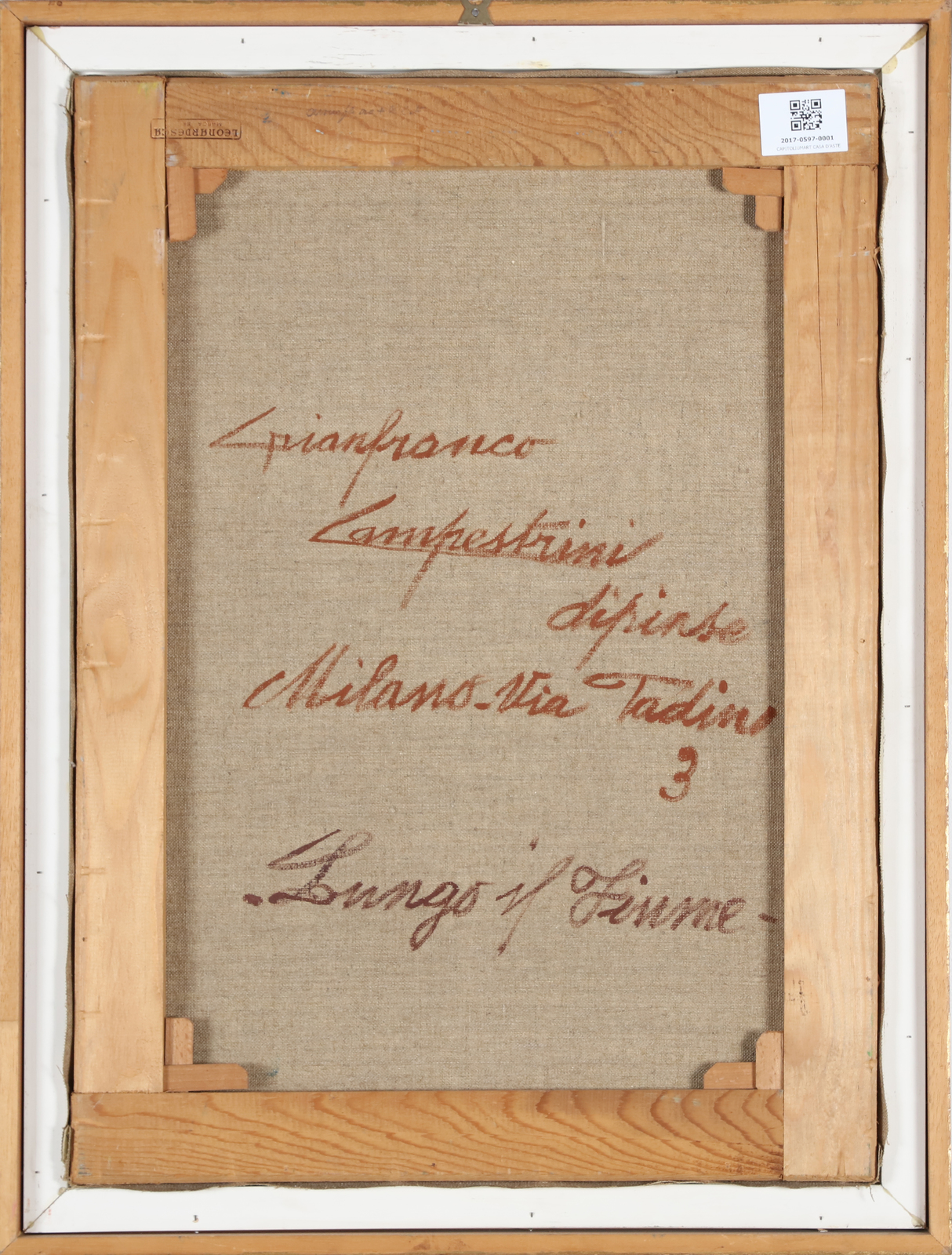 CAMPESTRINI GIANFRANCO (1901 - 1979) Lungo il fiume. Olio su tela . Cm 50,00 x 70,00. Firma in basso a destra. Al retro titolo e firma. Cornice presente