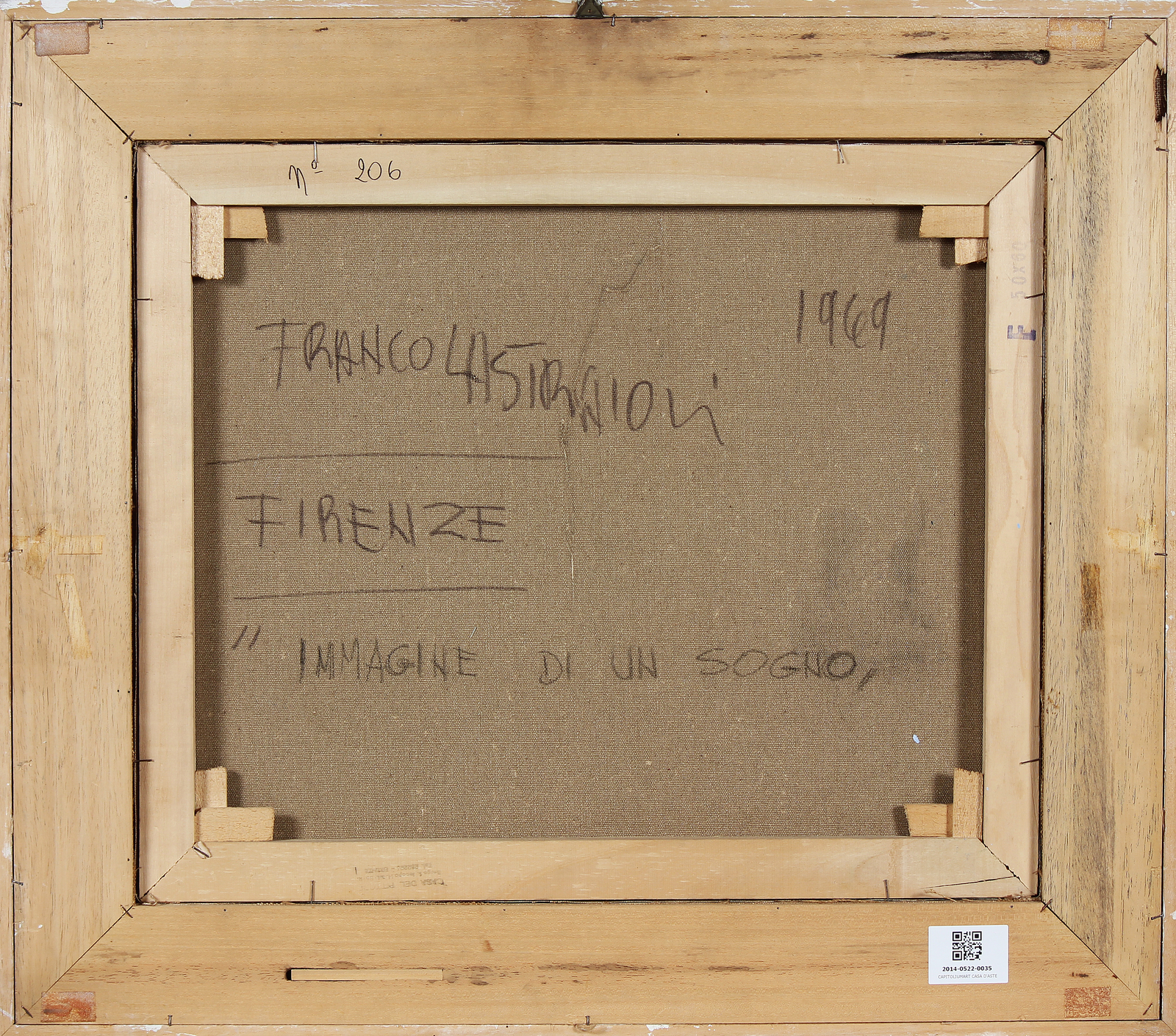 LASTRAIOLI FRANCO (n. 1931) Immagine di un sogno. 1969. Olio su tela . Cm 60,00 x 50,00. Firma e anno in basso a destra. Al retro titolo, firma e anno. Cornice presente