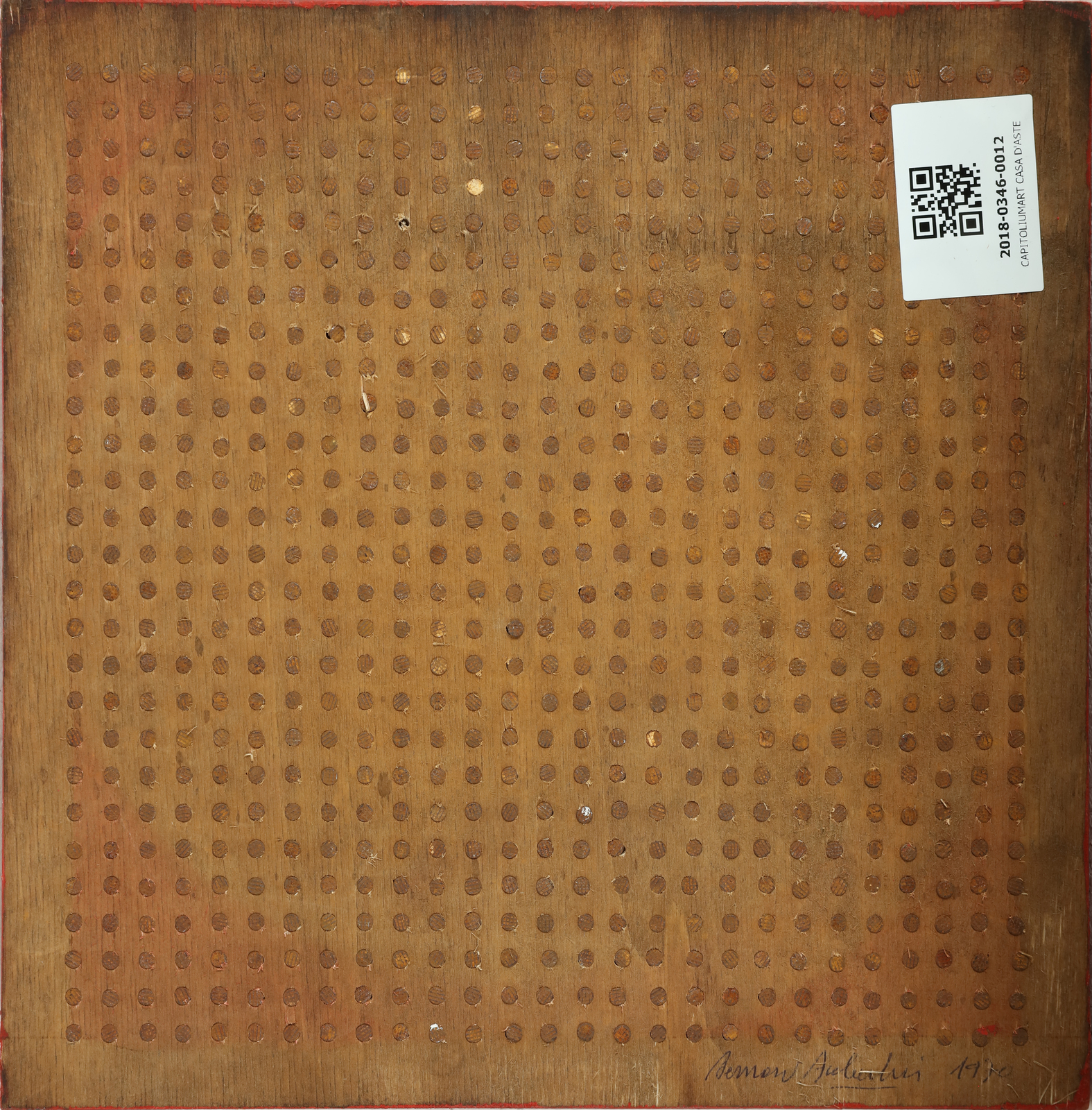 AUBERTIN BERNARD (1934 - 2015) Tableau Clous. 1970. Chiodi su tavola. Cm 30,00 x 30,00. Al retro firma e anno. Opera archiviata presso l'Archivio Bernard Aubertin, Brescia come da documentazione fotografica allegata all'opera riportante il relativo numero d'inventario. Autentica dell'artista su fotografia con timbro e firma di Giancarlo Rovetta.