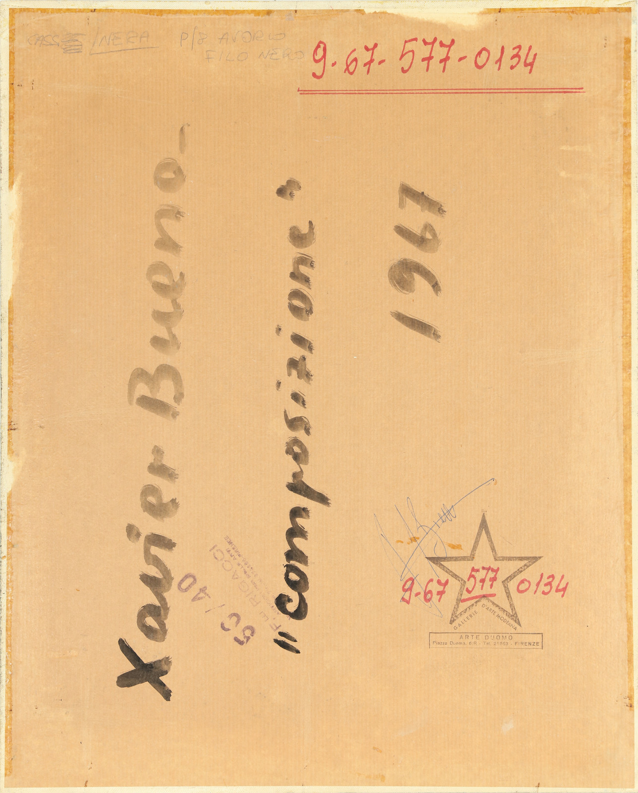 BUENO XAVIER (1915 - 1979) Composizione. 1967. Olio su cartone telato. Cm 50,00 x 60,00. Firma in alto a sinistra. Al retro titolo, firma, anno e timbro Galleria Arte Duomo, Firenze. Autentica su fotografia a cura di Giovanni Battista Bianco con il relativo numero d'inventario. Cornice presente