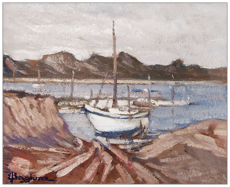 ENRICO BOGGIONE Torino 1889 – Torino 1985 Seguendo il Tamigi – Inghilterra 1970 Olio su cartone 24 x 30. Firma in b. a s.; sul verso titolo, firma e data. B.A.: 50