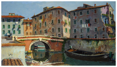 GIANCARLO LANDI Firenze 1937 C’era ‘na vorta Olio su cartone pressato 34 x 60. Firma in b. a s.; sul verso titolo e firma. B.A.: 100