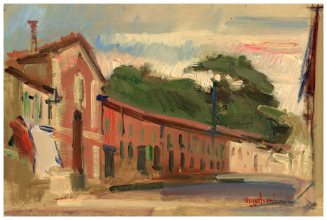 FRANCO MAZZACCHERINI La Spezia 1939 – Livorno 1999 Livorno, via Roma 1971 Olio su tavola 20 x 30. Firma in b. a d.; sul verso località, data e firma + Certificato di Autenticità “Centro Culturale per la divulgazione delle arti visive, Lamezia Terme”. B.A.: 60