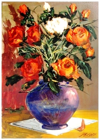 LORENZO PALAZZI Livorno 1921 – Livorno 1990 Rose 1960 Olio su faesite 70 x 50. Firma in b. a d.; sul verso data, titolo, firma, tecnica e misure + etichetta dell’artista + certificato d’autenticità Casa d’Arte Toscana, Livorno. B.A.: 50