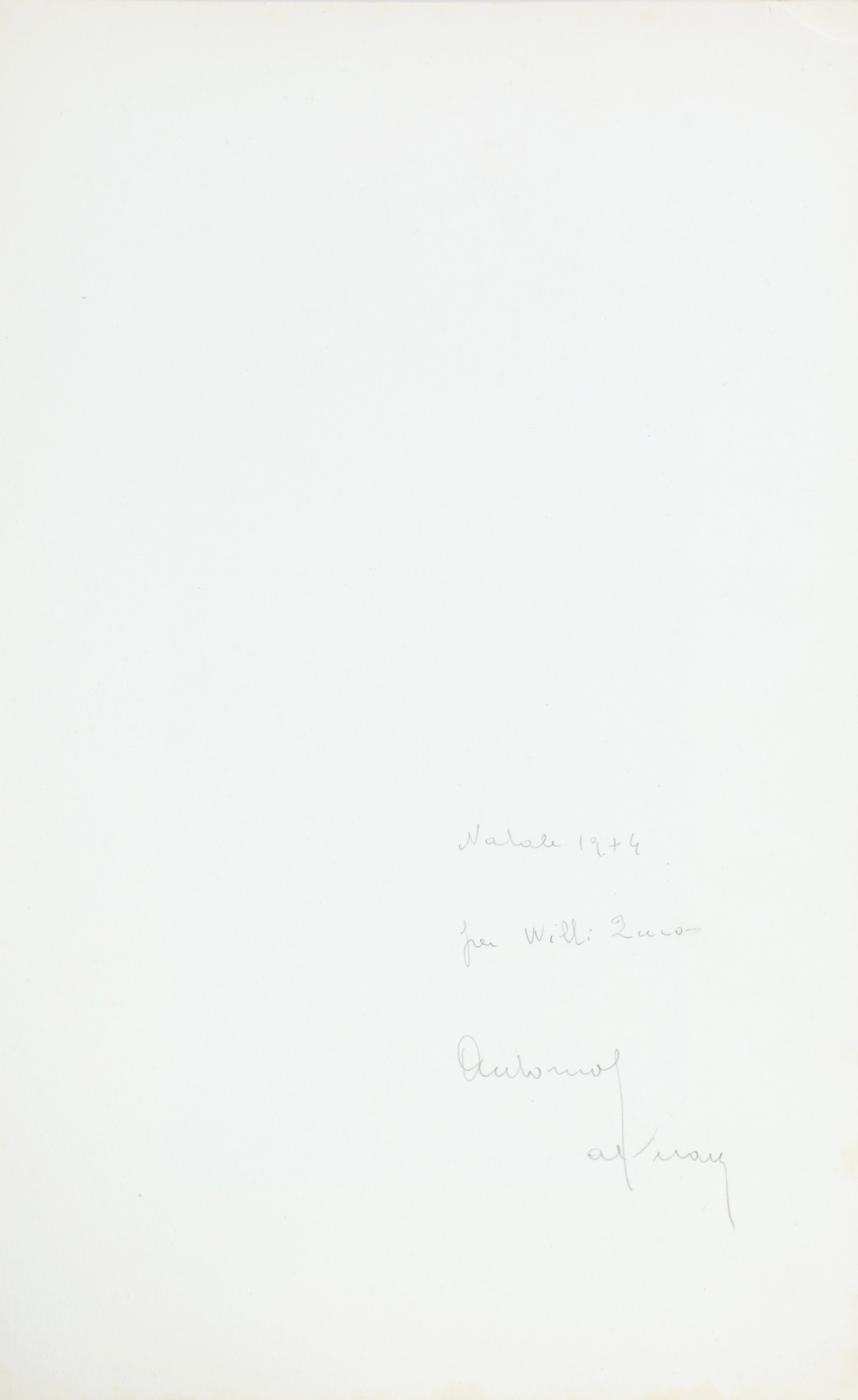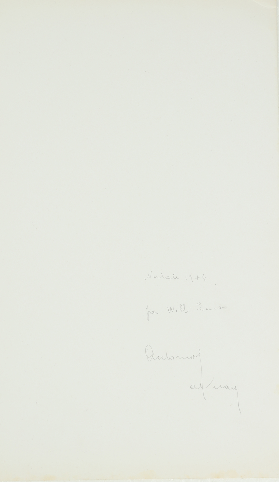 CALDERARA ANTONIO (1903 - 1978) E. Un testo e 16 serigrafie di Antonio Calderara. 1974. Serigrafia (cartella completa). Cm 22,50 x 37,50. P.a. Samuele Villa, Muggio, stampatore. Ogni foglio presenta tiratura, firma e anno a matita al retro. Confezione originale. Fioriture. Esemplare in bianco e nero destinato e dedicato (Natale 1974 per Willy Zuco) all'editore, mancante del testo e dell'immagine introduttivi.