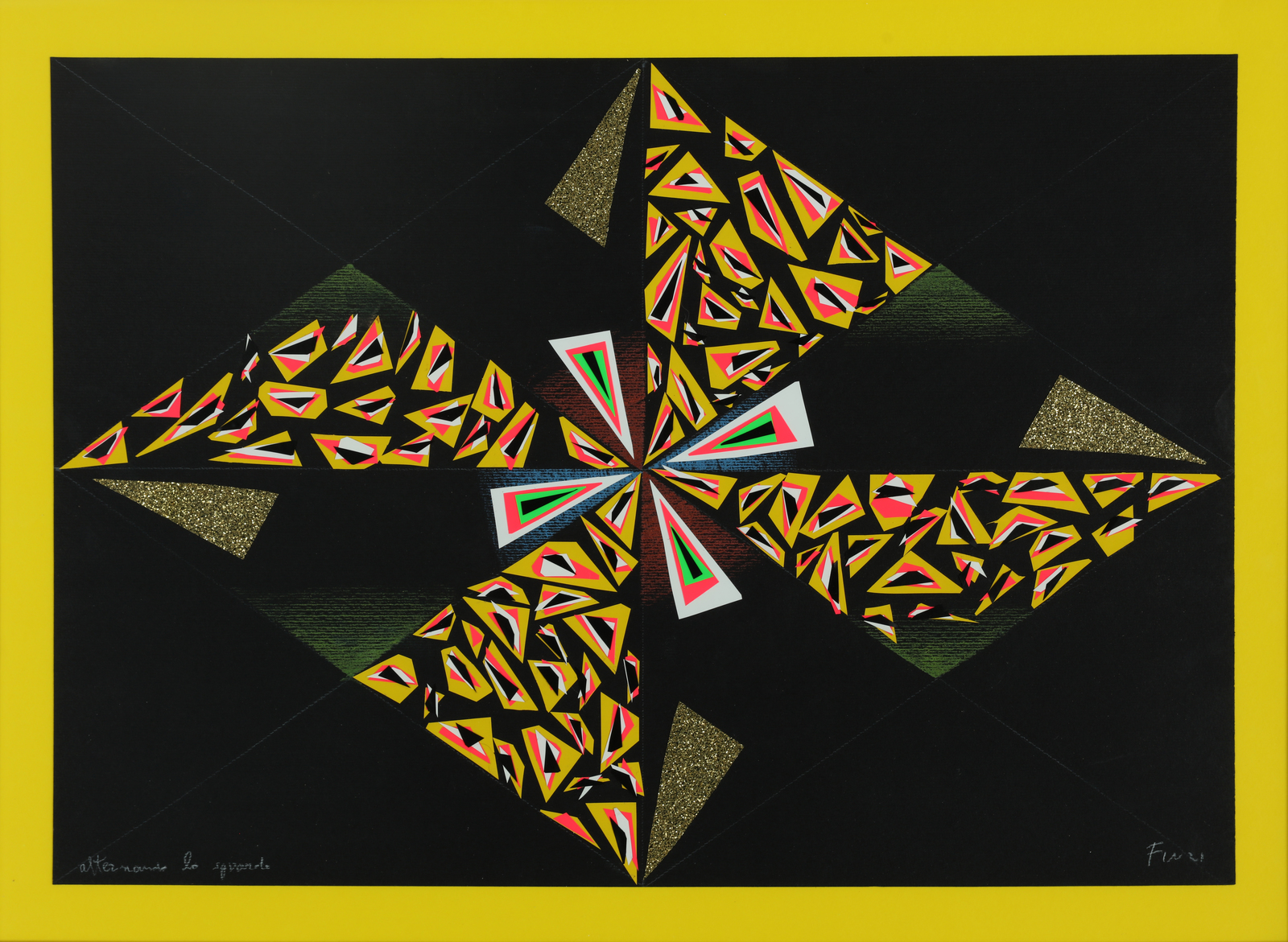 FINZI ENNIO (n. 1931) Alternating the look. Mixed media on paper. Cm 50,00 x 35,00. Title lower left. Signature lower right. Artist's authenticity certificate on photo. Cornice presente