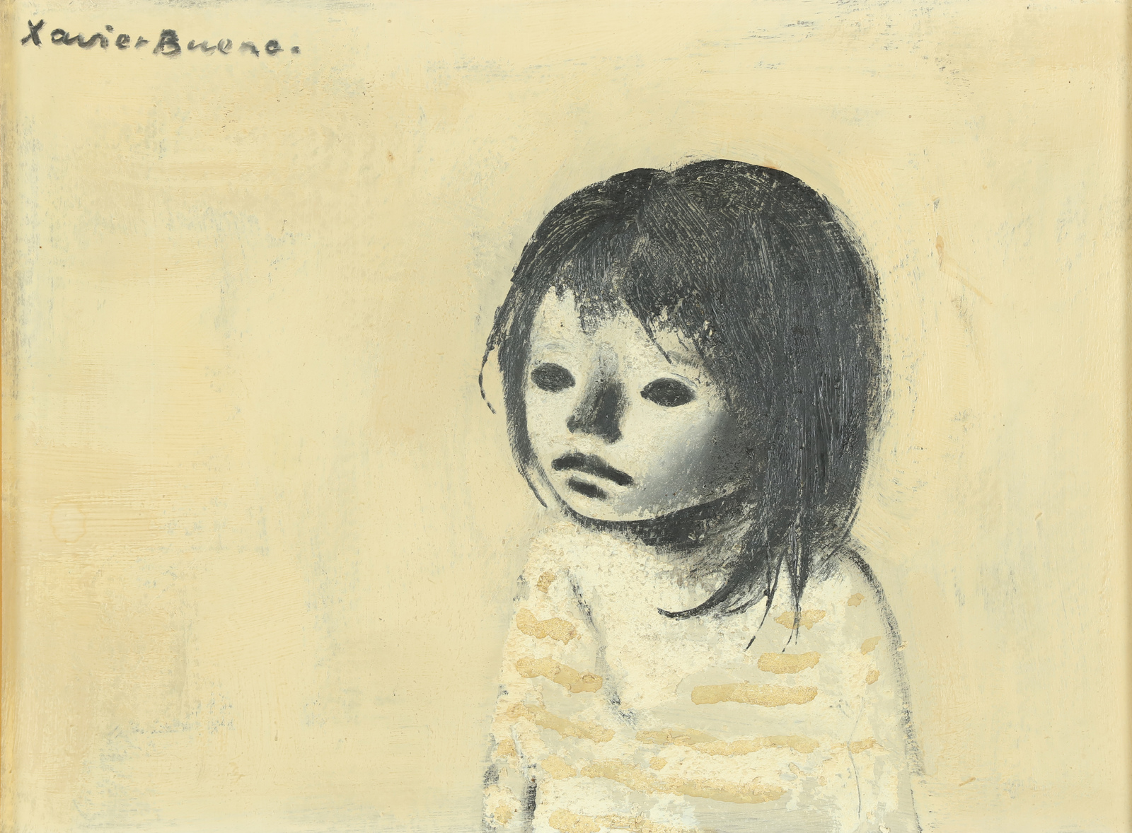 BUENO XAVIER (1915 - 1979) Bambina. 1967. Olio su compensato. Cm 40,00 x 30,00. Firma in alto a sinistra. Al retro titolo, firma, anno e timbro Galleria Arte Arno e Galleria Arte Duomo, Firenze. Certificato di provenienza e garanzia di Remo Giovanbattista Bianco. Provenienza: Telemarket, Roncadelle (Bs). Pubblicazioni: Catalogo Generale, Primo Volume, Editoriale Giorgio Mondadori, pag. 164. Provenienza: Galleria Arte CLub, Catania; Collezione Bianco, Brescia; COllezione privata, Milano. Cornice presente
