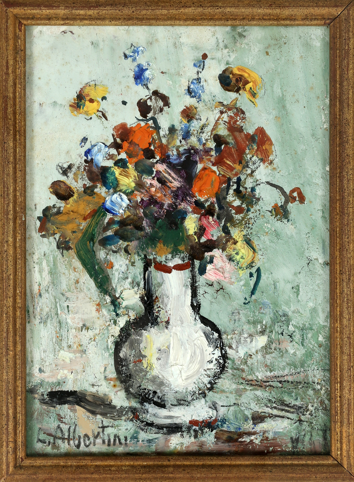ALBERTINI LUCIANO (1910 - 1985) Fiori. Olio su cartone pressato. Cm 14,00 x 20,00. Firma in basso a sinistra. Titolo al retro. Cornice presente