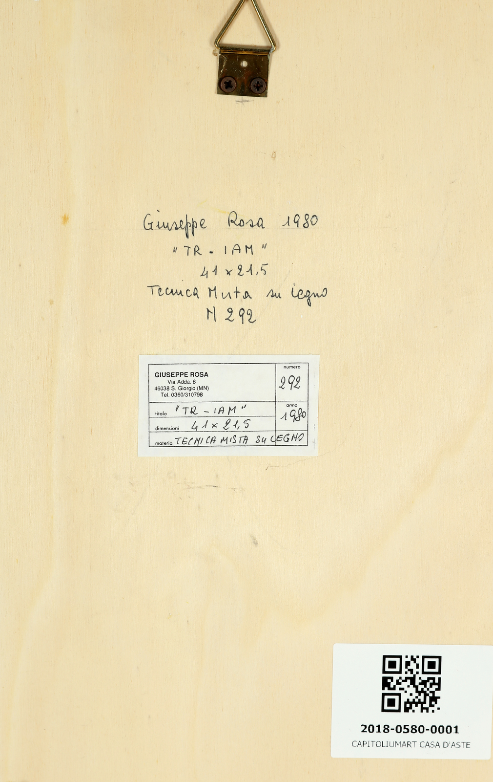 ROSA GIUSEPPE (n. 1948) TR-IAM. 1980. Tecnica mista su legno. Cm 21,50 x 41,00. Al retro titolo, firma, anno e cartiglio descrittivo dell'artista.