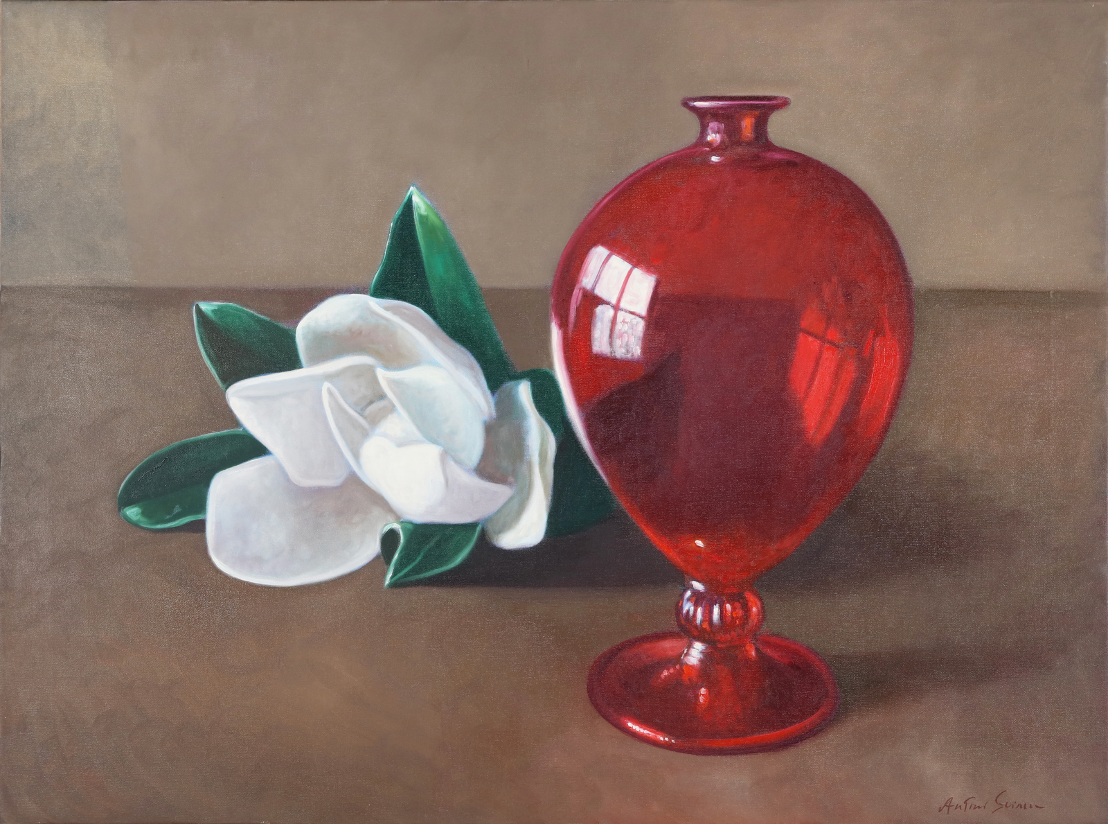SCIACCA ANTONIO (n. 1957) Magnolia con Venini. Olio su tela . Cm 90,00 x 70,00. Firma in basso a destra. Al retro titolo e firma. Autentica dell'artista su fotografia.
