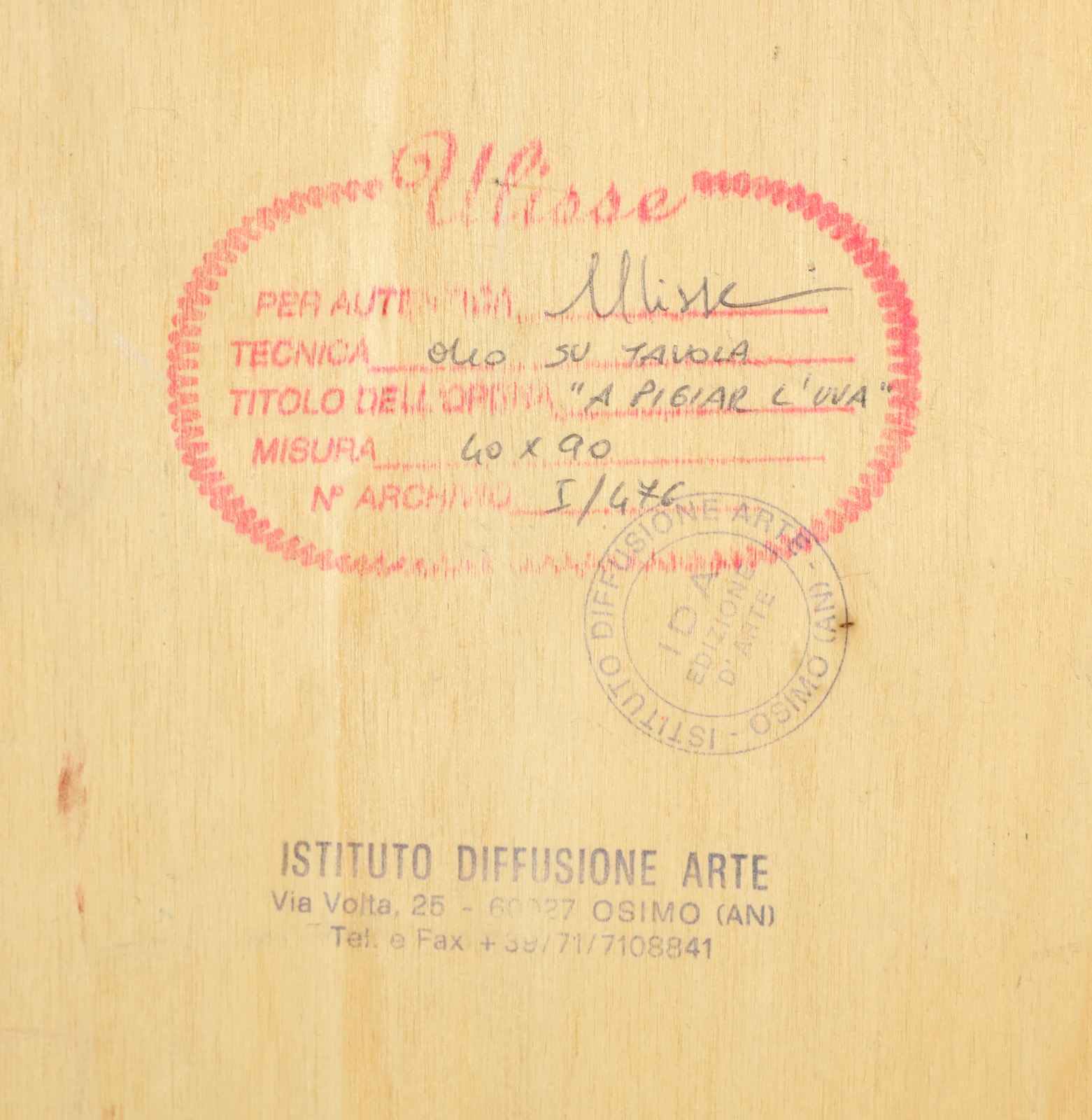 ULISSE (n. 1957) A pigiar l'uva. Olio su tavola. Cm 90,00 x 40,00. Firma in basso a destra. Al retro timbro dell'artista e timbro Istituto diffusione arte, Osimo. Cornice presente