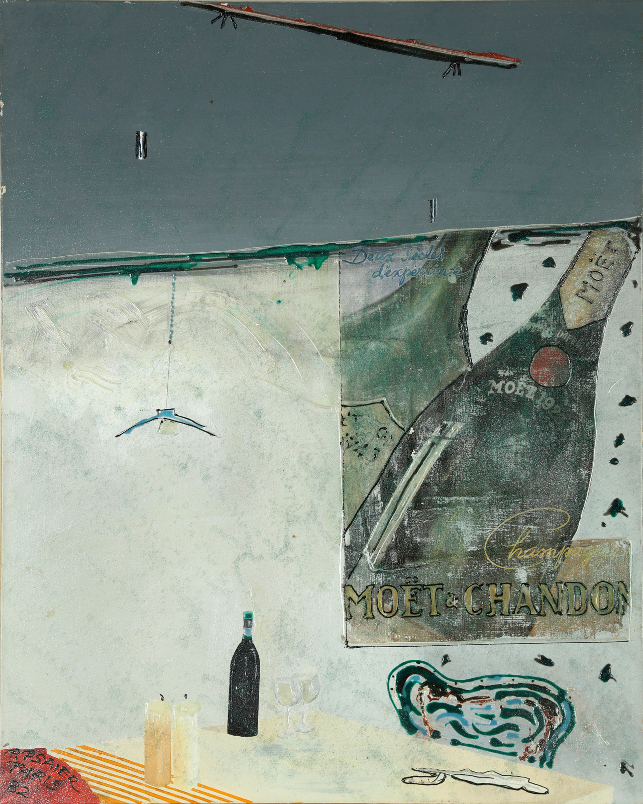 PSAIER PIETRO (1939 - 2004) The Paris years, Moet Chandon concept proof. 1982. Mixed media on canvas. Cm 61,00 x 77,00. Signature and year lower left. At the back authenticity certificate with artist's stamp and signature.