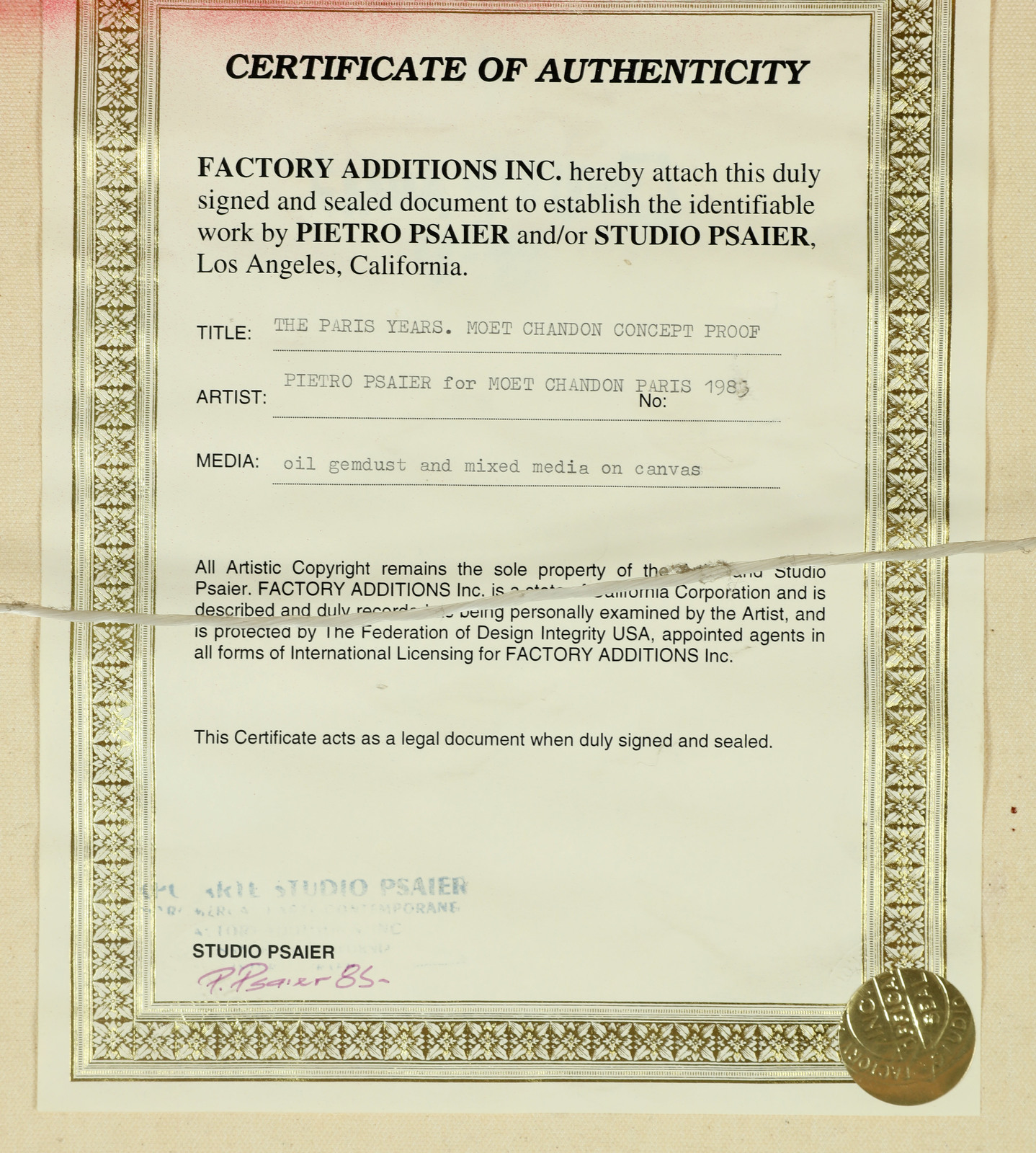PSAIER PIETRO (1939 - 2004) The Paris years, Moet Chandon concept proof. 1982. Tecnica mista su tela. Cm 61,00 x 77,00. Firma e anno in basso a sinistra. Al retro certificato di autenticità con timbro e firma dell'artista.