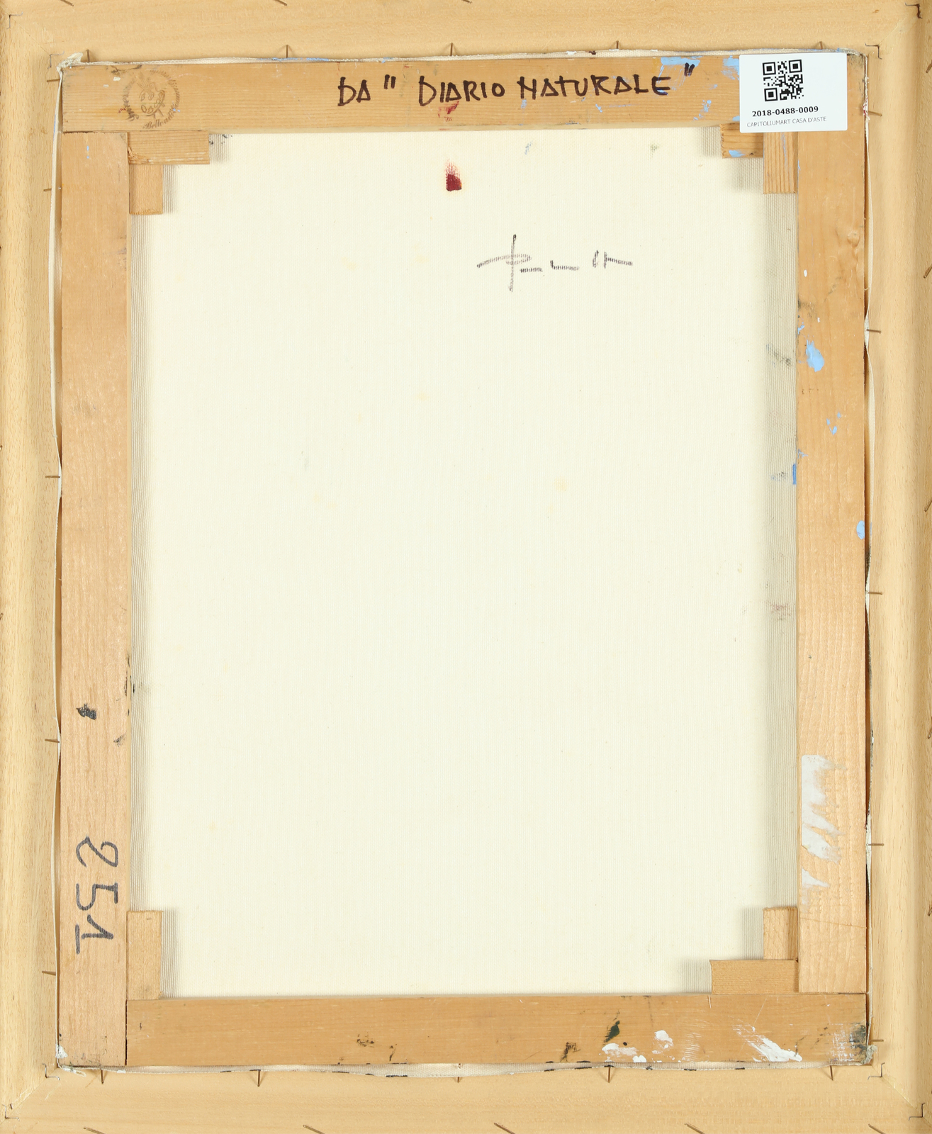 PEDRETTI ANTONIO Diario naturale. Olio su tela . Cm 40,00 x 50,00. Firma in basso a destra. Al retro titolo e firma. Autentica dell'artista su fotografia. Cornice presente