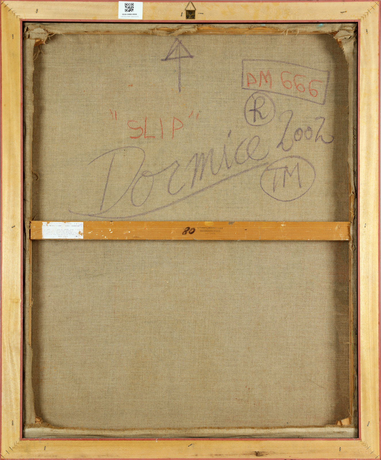 DORMICE (n. 1999) Slip. 2002. Olio su tela . Cm 80,00 x 100,00. Al retro titolo, firma e anno. Autentica dell'artista su fotografia. Cornice presente