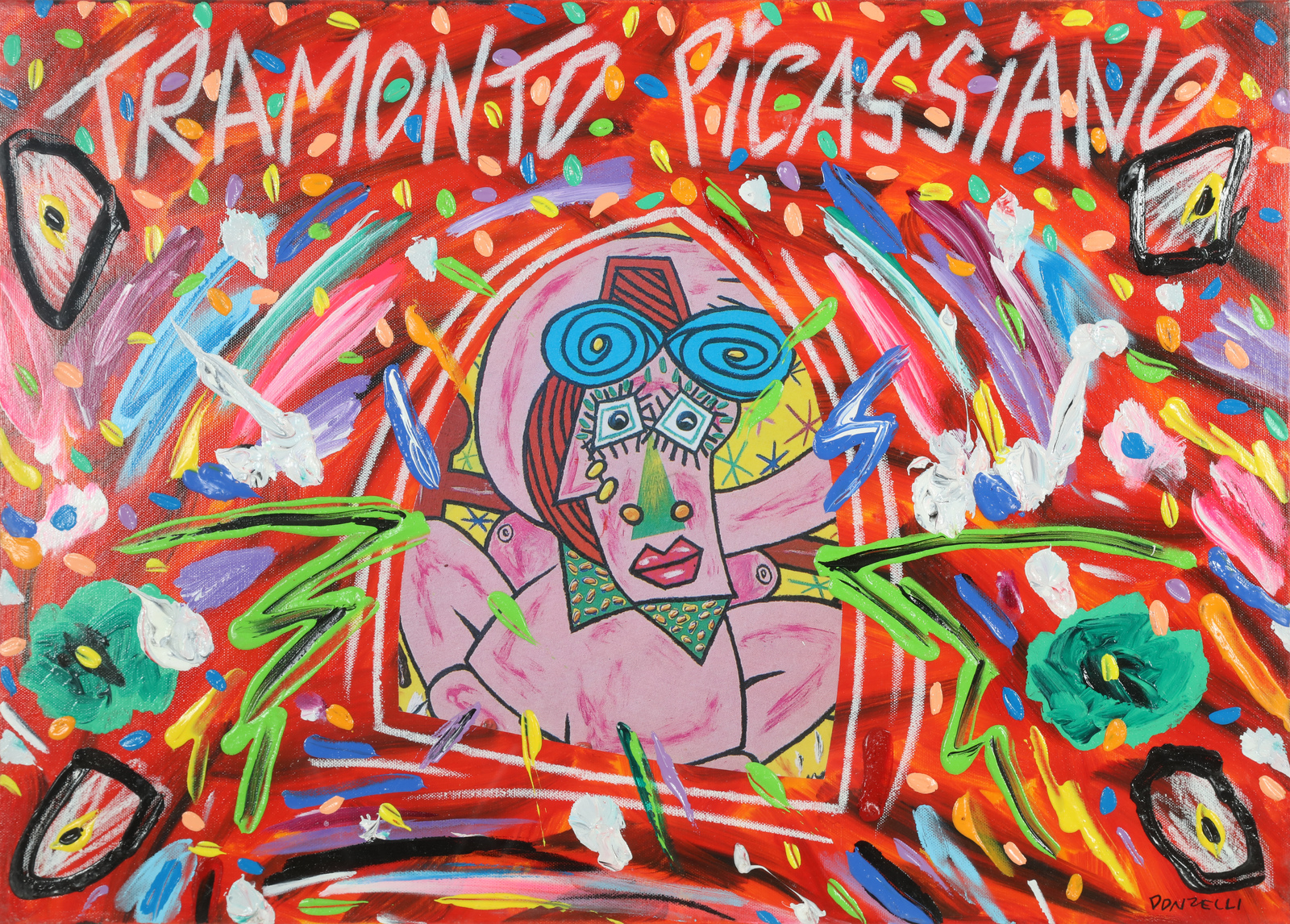 DONZELLI BRUNO (n. 1941) Picasso sunset. Mixed media on canvas. Cm 70,00 x 50,00. Signature lower right. At the back title and signature. Artist's authenticity certificate on photo. Cornice presente