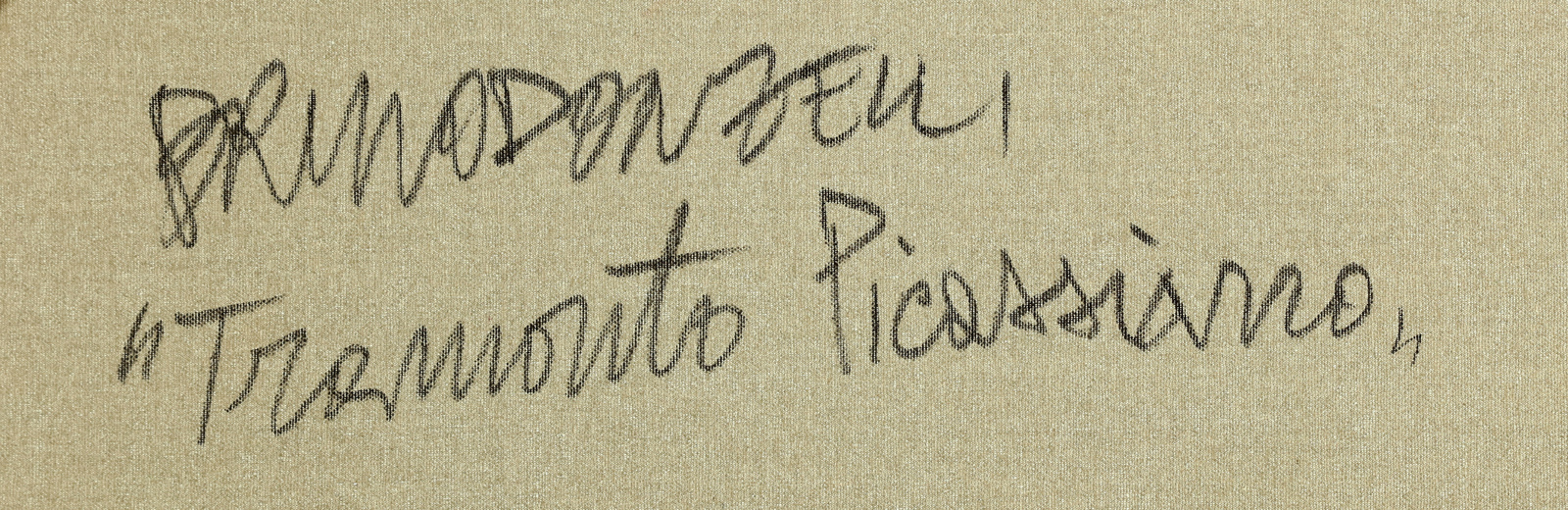 DONZELLI BRUNO (n. 1941) Tramonto picassiano. Tecnica mista su tela. Cm 70,00 x 50,00. Firma in basso a destra. Al retro titolo e firma. Autentica dell'artista su fotografia. Cornice presente