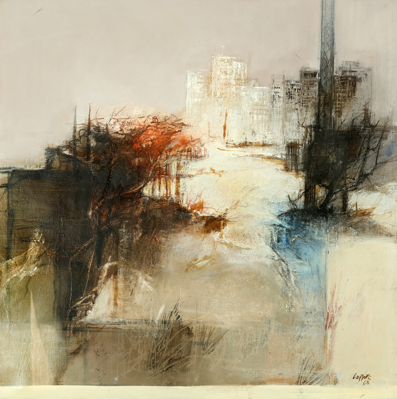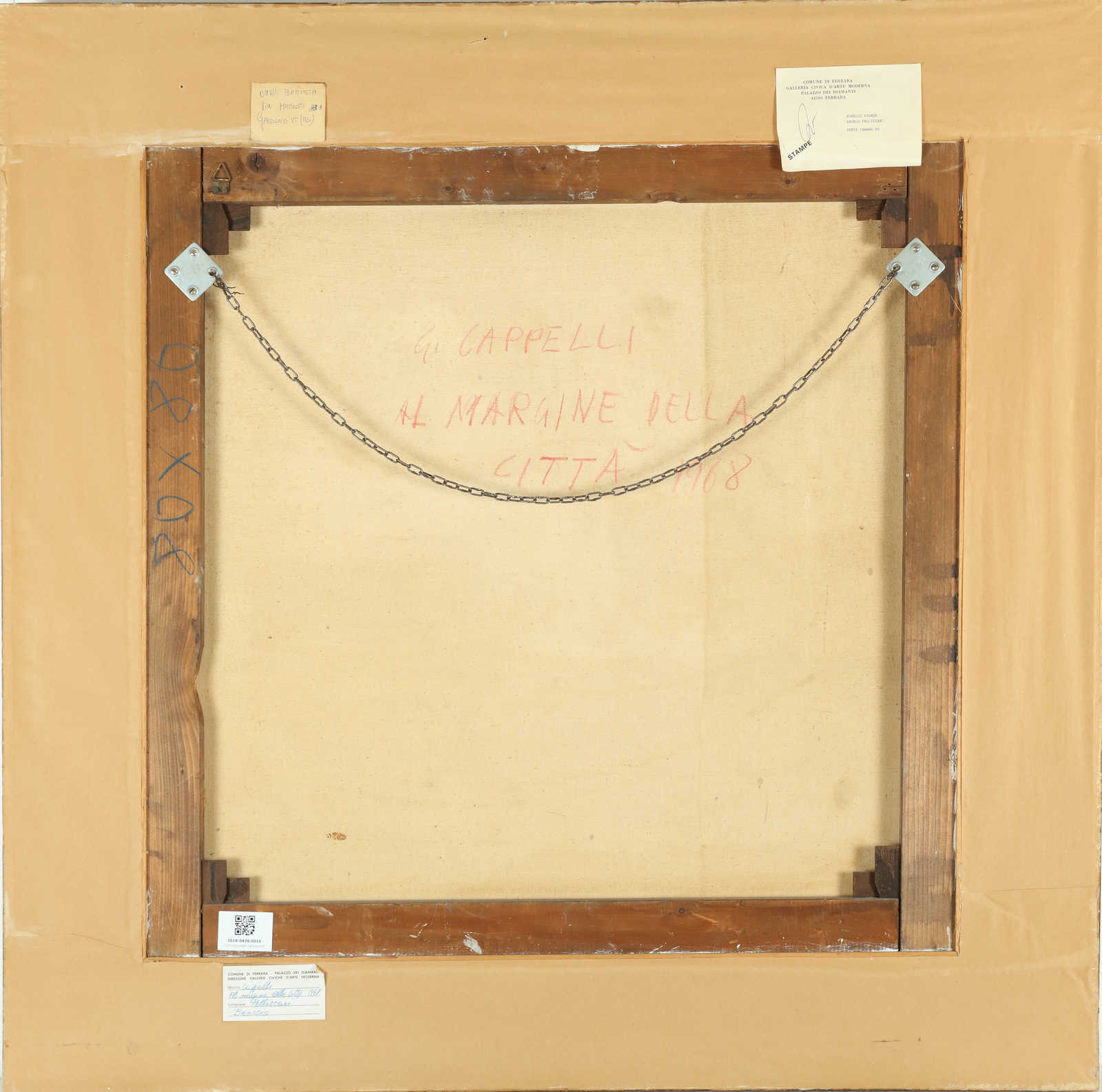 CAPPELLI GIOVANNI (1923 - 1994) At the edge of the city. 1968. Oil on canvas . Cm 80,00 x 80,00. Signature and year lower right. At the back title, signature, year and Palazzo dei Diamanti - Direzione Gallerie civiche d'arte moderna, Ferrara label. Provenance: Pellizzari Collection, Brescia. Artist's authenticity certificate on photo. Cornice presente