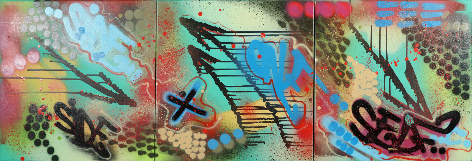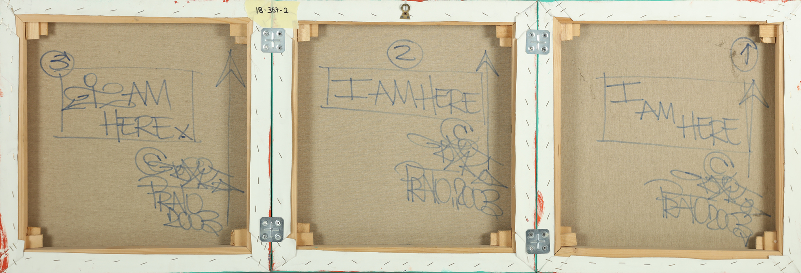 TOXIC (n. 1965) Trittico. I am here. 2003. Acrilico su tela. Cm 150,00 x 50,00. Al retro titolo, firma e anno. Autentica dell'artista su fotografia ( datazione errata).