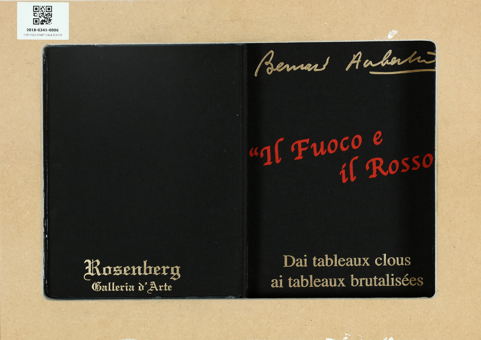 AUBERTIN BERNARD (1934 - 2015) Livre Brulé Rosenberg. 2010. Burned book. Cm 45,00 x 31,00. Signature lower right. Rosenberg Gallery, Milan authenticity certificate on photo. Within plexiglass case. Cornice presente
