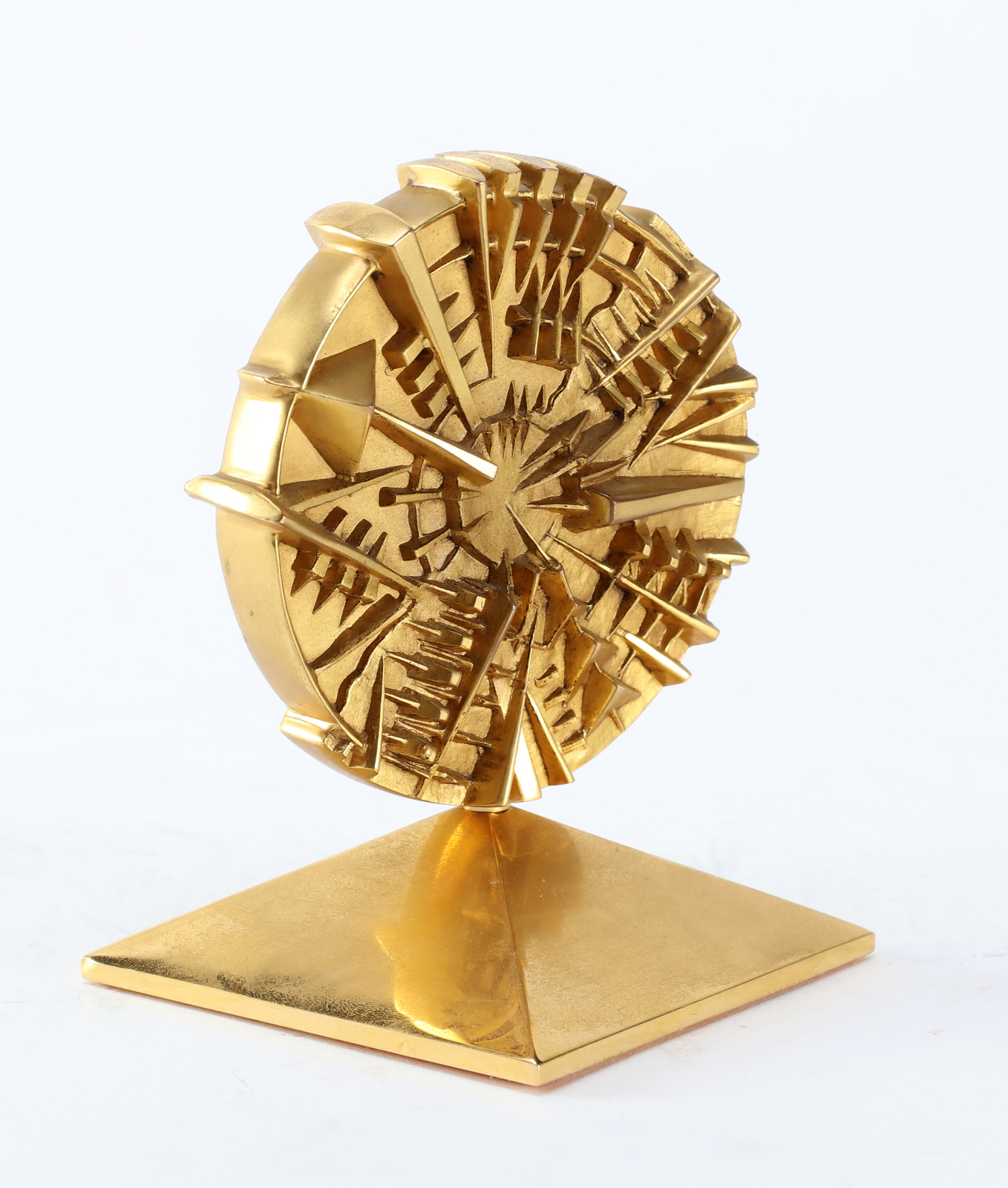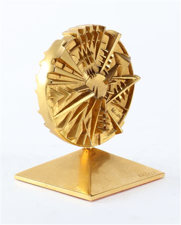 POMODORO ARNALDO (n. 1926) Untitled. Gilded bronze. Cm 9,00 x 12,00. XIV/XXX. Edition and signature engraved lower right. Diameter: 9 cm. Edition created for Ars D, Milan 1990, exclusive production for Raggio di Sole Finanziaria in 250 ccopies + XXX. The artwork is archived at Arnaldo Pomodoro Foundation, Milan.