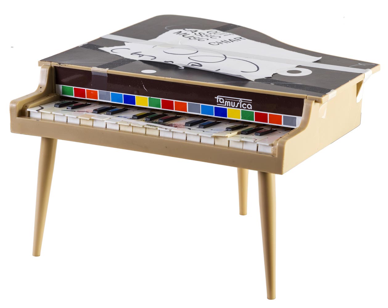 Tecnica mista e collage su piccolo pianoforte entro teca in plexiglass