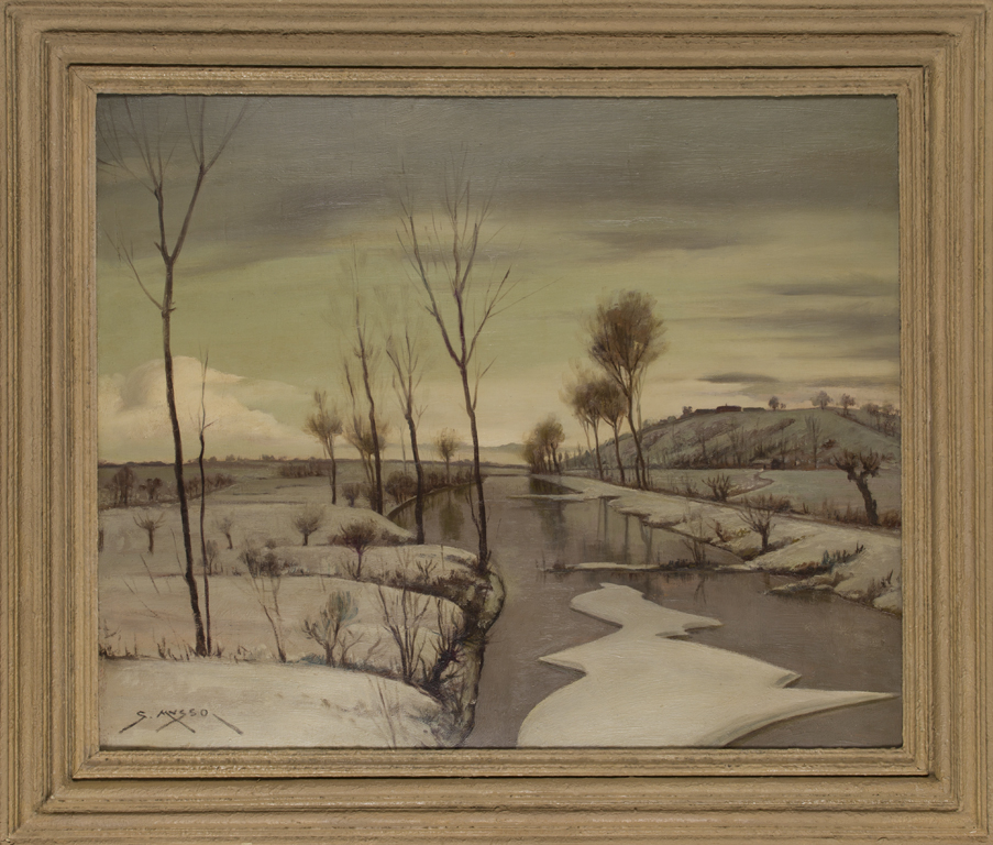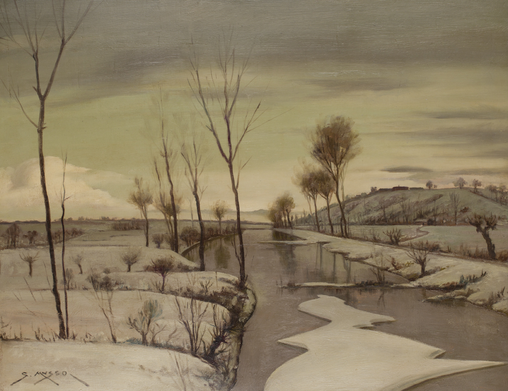 GIULIO MUSSO (1851-1915)Campagna innevataOlio su tavolacm 60x73Firma al...