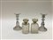 Lotto composto da due bottiglie portaliquore con tappo e ghiera in argento e due candelieri in vetro molato (difetti)